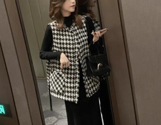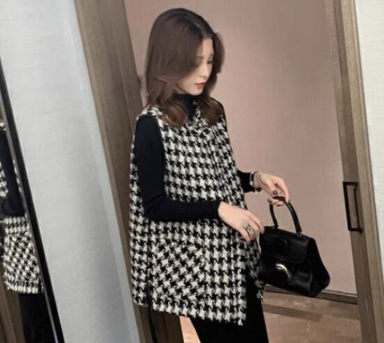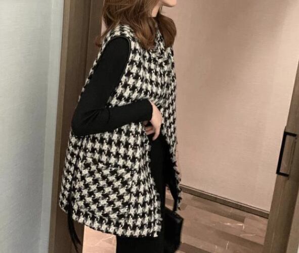 レディース ジャケット ベスト ウール ミドル丈 袖なし ノースリーブ Vネック 前開き ボタンなし 大人可愛い きれいめ カジュアル 上品 おしゃれ かっこいい レトロ こなれ感 個性的 クール エレガント モダン 存在感 クラシカル 知的 シック 高級感 スタイリッシュ 千鳥格子 春 ママ OL デート お出かけ 旅行 女子会 休日 ショッピング お花見 カフェ モノトーン 重ね着 普段使い 着回し レイヤード M L ブラック 大人デザイン