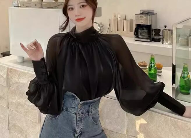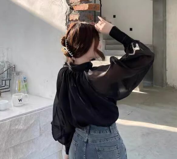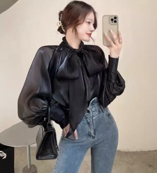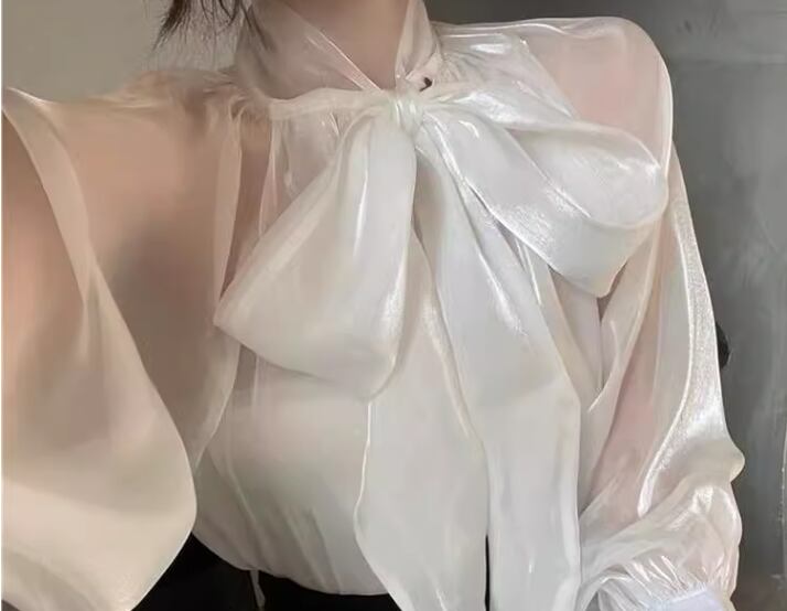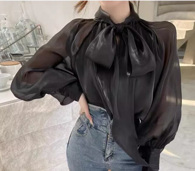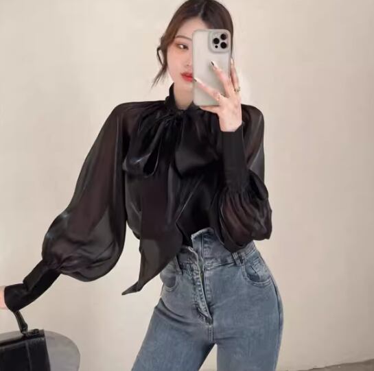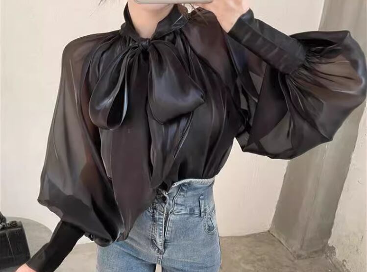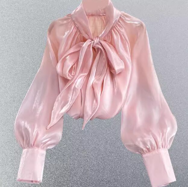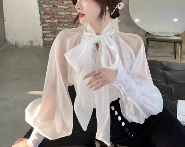 大きめのリボンタイとボリュームのあるランタンスリーブがアクセントになった、大人可愛い長袖のシフォンシャツ。