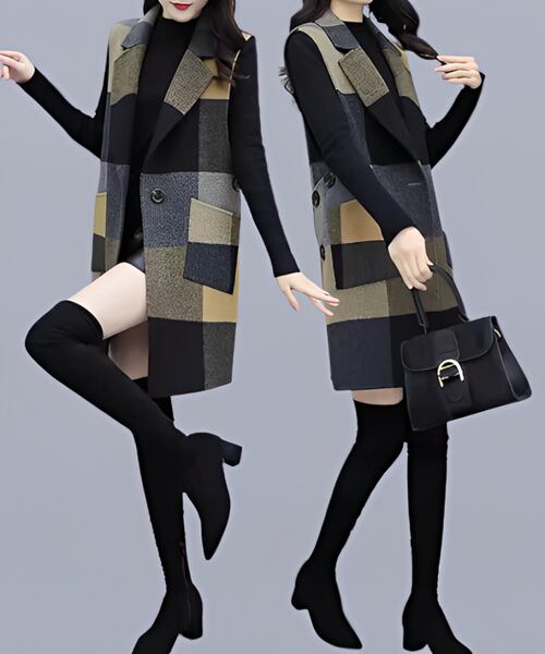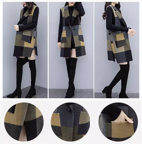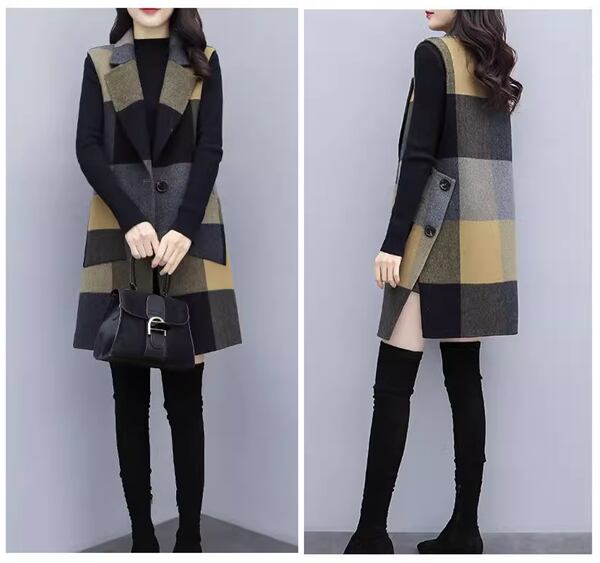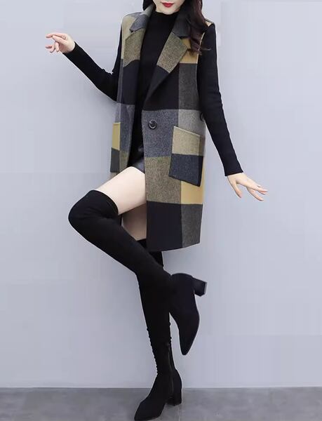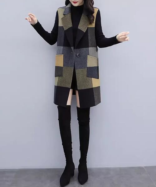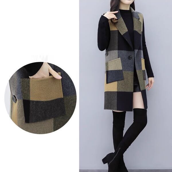 レディース コートウールベストトップス ベスト 袖なし ノースリーブ ストレートミドル丈 ミディアム丈 ウェーブカラー POLO襟 ルースタイプ 中厚手 ルーズ 芸術的 優しい チェック シーズンレス 10代 20代 通勤 通学 ショッピング カフェ 重ね着 韓国