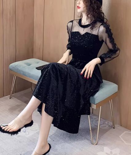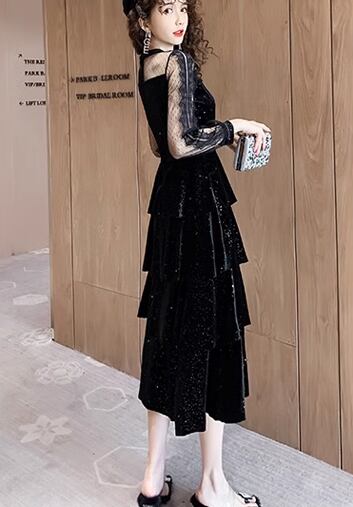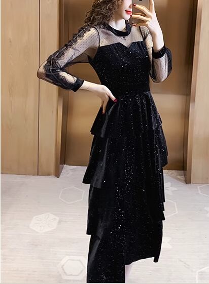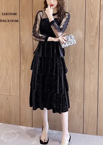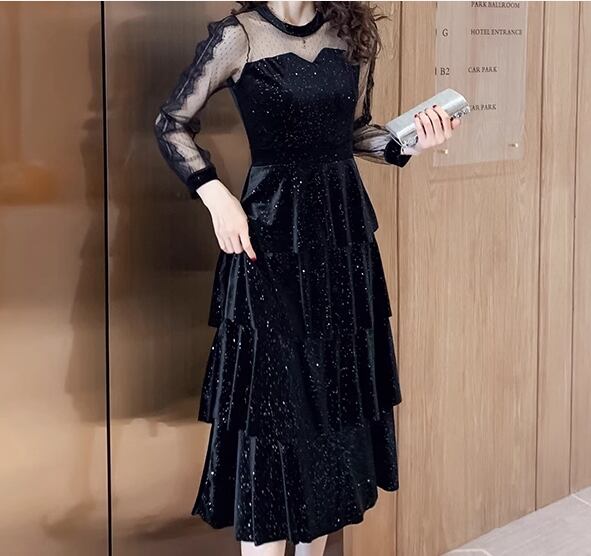 レディース ドレス ケーキスカート ロング 長袖 ラウンドネック スリム 細身 Aライン プリーツ レース ファスナー ハイウエスト 透け感 スパンコール 切り替えデザイン ドッキング ベルベット かわいい 大人可愛い きれいめ カジュアル 上品 おしゃれ レトロ こなれ感 ガーリー 個性的 エレガント モダン 主役級 存在感 抜け感 キュート ラグジュアリー シック 高級感 芸術的 アーティスティック 華やか 秋 冬 デート お出かけ パーティー イベント 韓国 S M L XL 小さめ ブラック