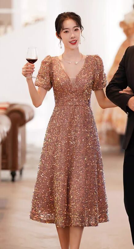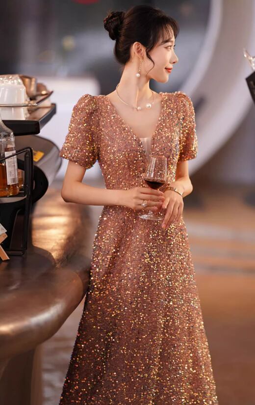 ドレス パーティー 二次会 披露宴 ステージ 舞台 フォーマル ラウンジ ロング 半袖 パフスリーブ 袖あり Vネック 襟なし プリンセスライン フレア Aライン イブニング ファスナー ハイウエスト スパンコール 可愛い きれいめ 大人可愛い 上品 おしゃれ エレガント 主役級 存在感 フォーマル ゴージャス エレガント セクシー 華やか 無地 パーティー イベント 美脚 脚長 高見え 光沢感 春 夏 秋 XS 2XL S M L XL シャンパン