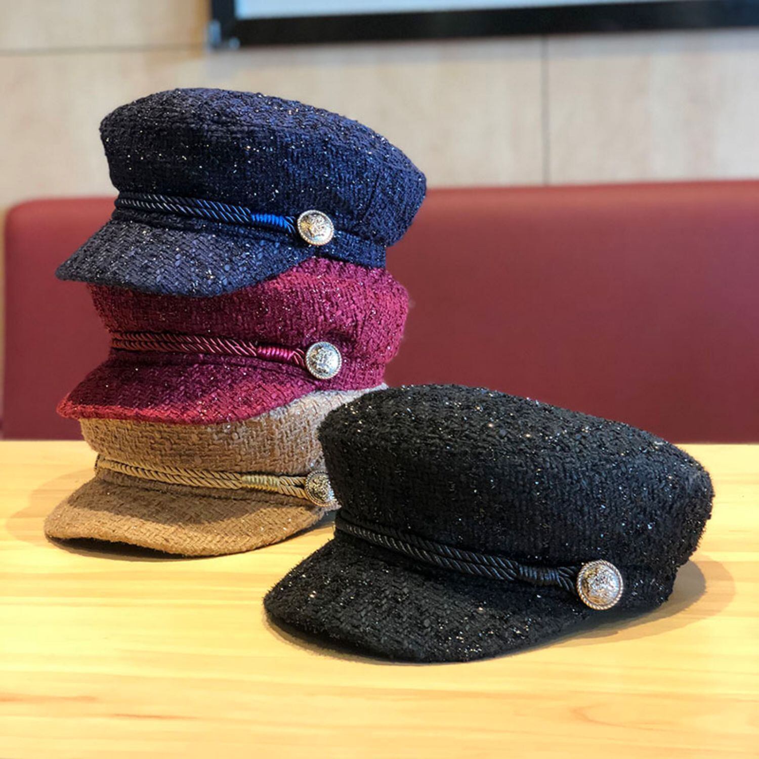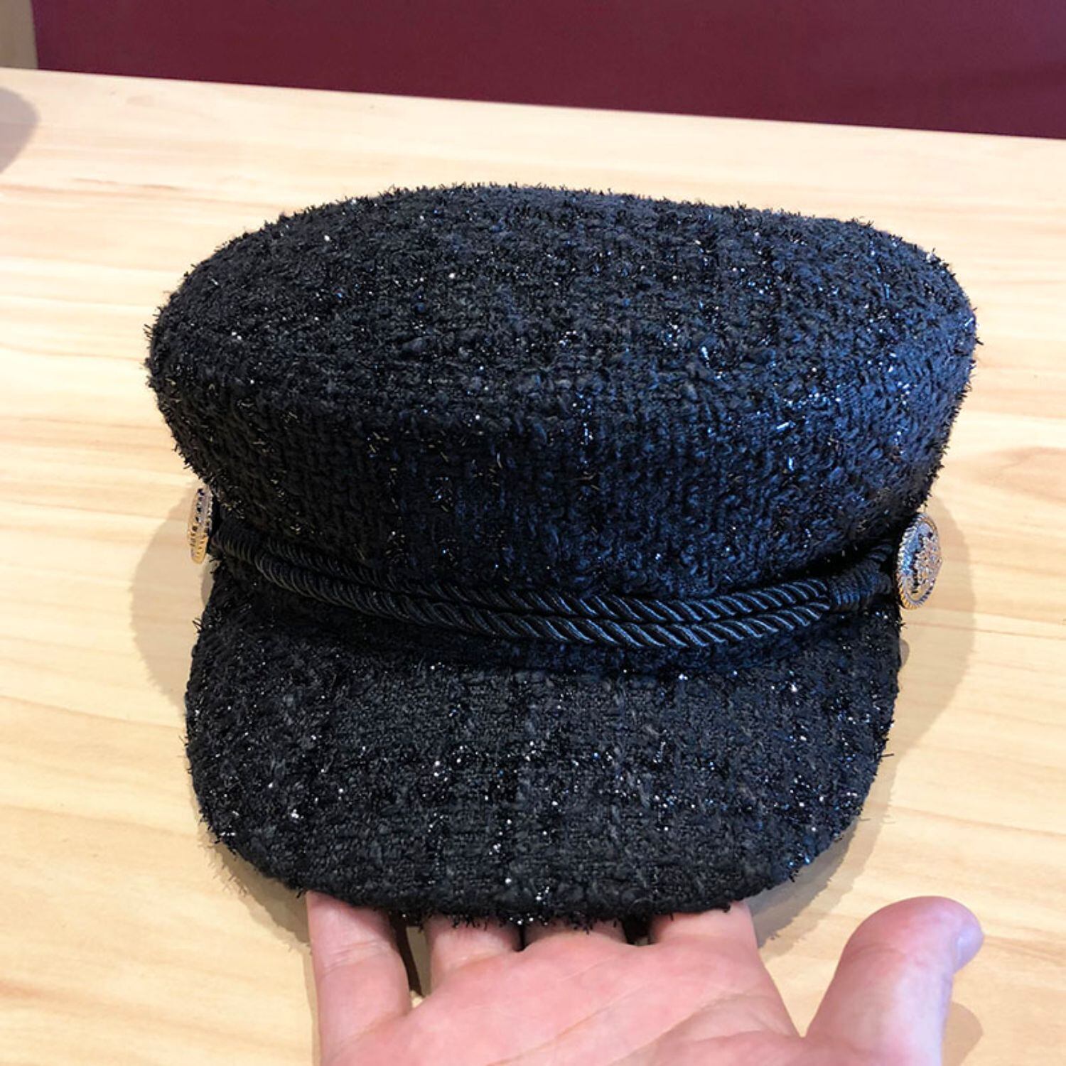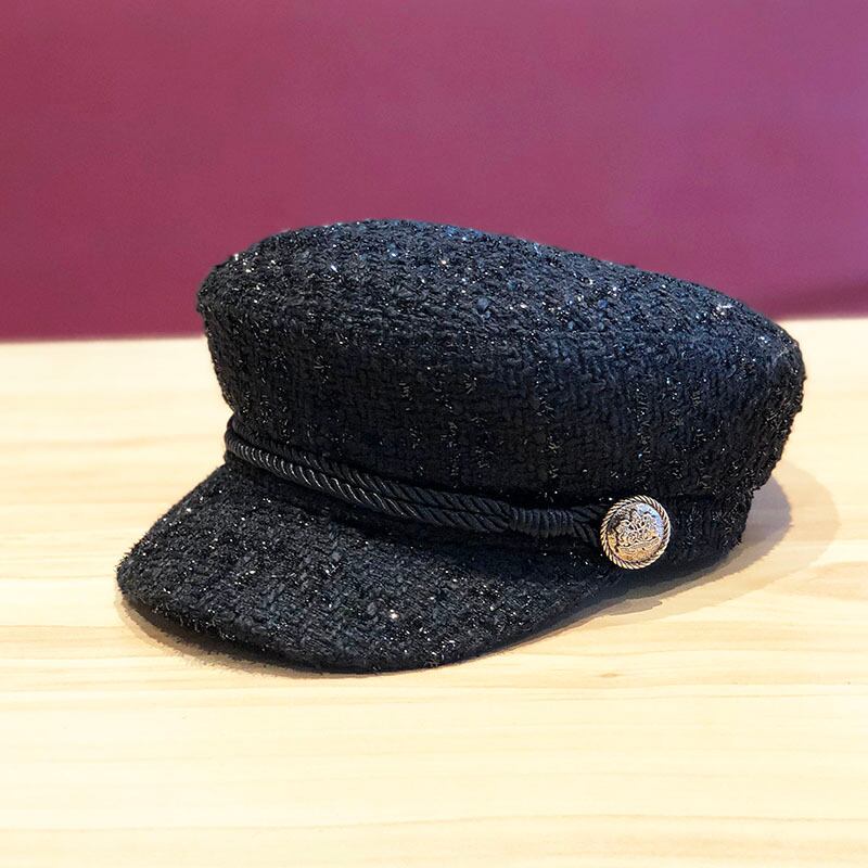 つば上にあしらったロープリボンとサイドのシルバーの飾りボタンがポイントのフラットトップキャスケットです。ツイード調の生地で秋~春までお使いいただけます。こなれた雰囲気を演出できて上品に決まるアイテムで、いつもの着こなしをおしゃれにアップデート。