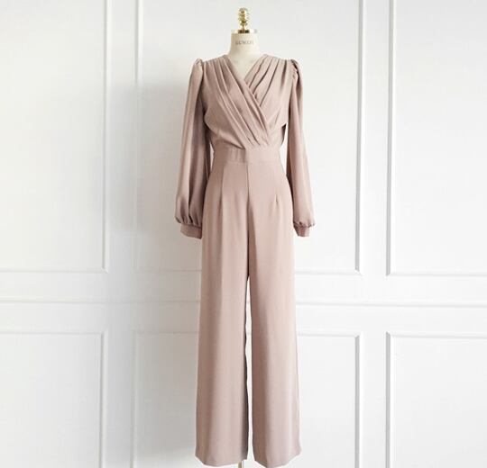 エレガントなVネックデザインと細身のシルエットが魅力のパンツドレスです。