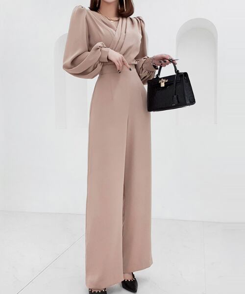 レディース パーティードレス パーティー 結婚式 二次会 披露宴 謝恩会 ロング 長袖 ボリューム Vネック スリム パンツ 細身 きれいめ シンプル 上品 かっこいい クール エレガント フォーマル シック 無地 パーティー デート 食事会 会食 美脚 脚長 高見え 格上げ 春 秋 冬 結婚式 二次会 披露宴 パーティー S M L XL スリム ベージュ ブラック