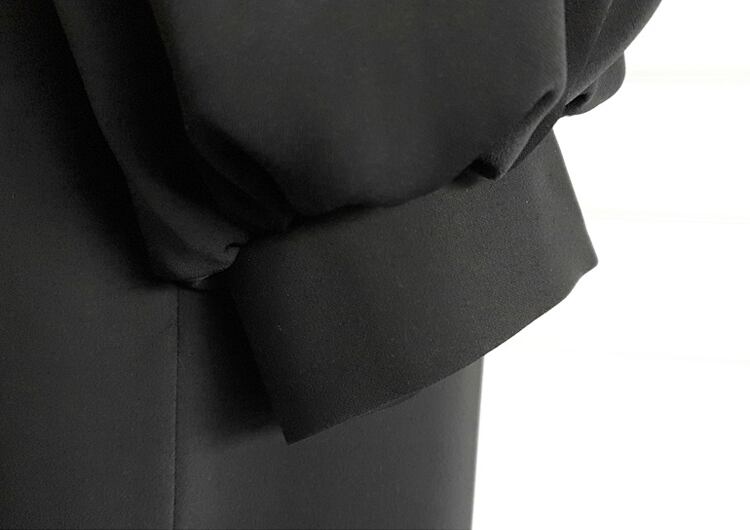 ボリューム袖とタイトなシルエットのバランスが女性らしさを際立てます。