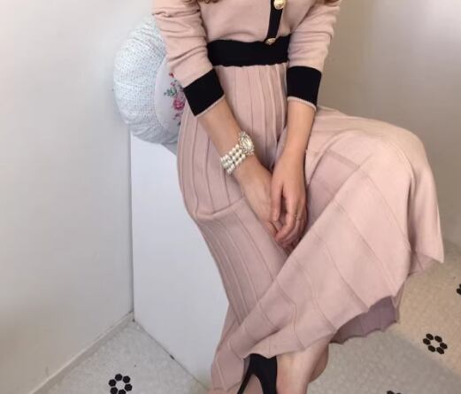 シックなカラーと大人可愛い異国風のデザインが魅力的なロング丈のニットワンピース。