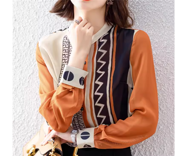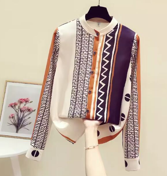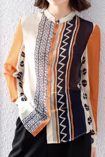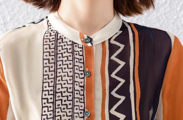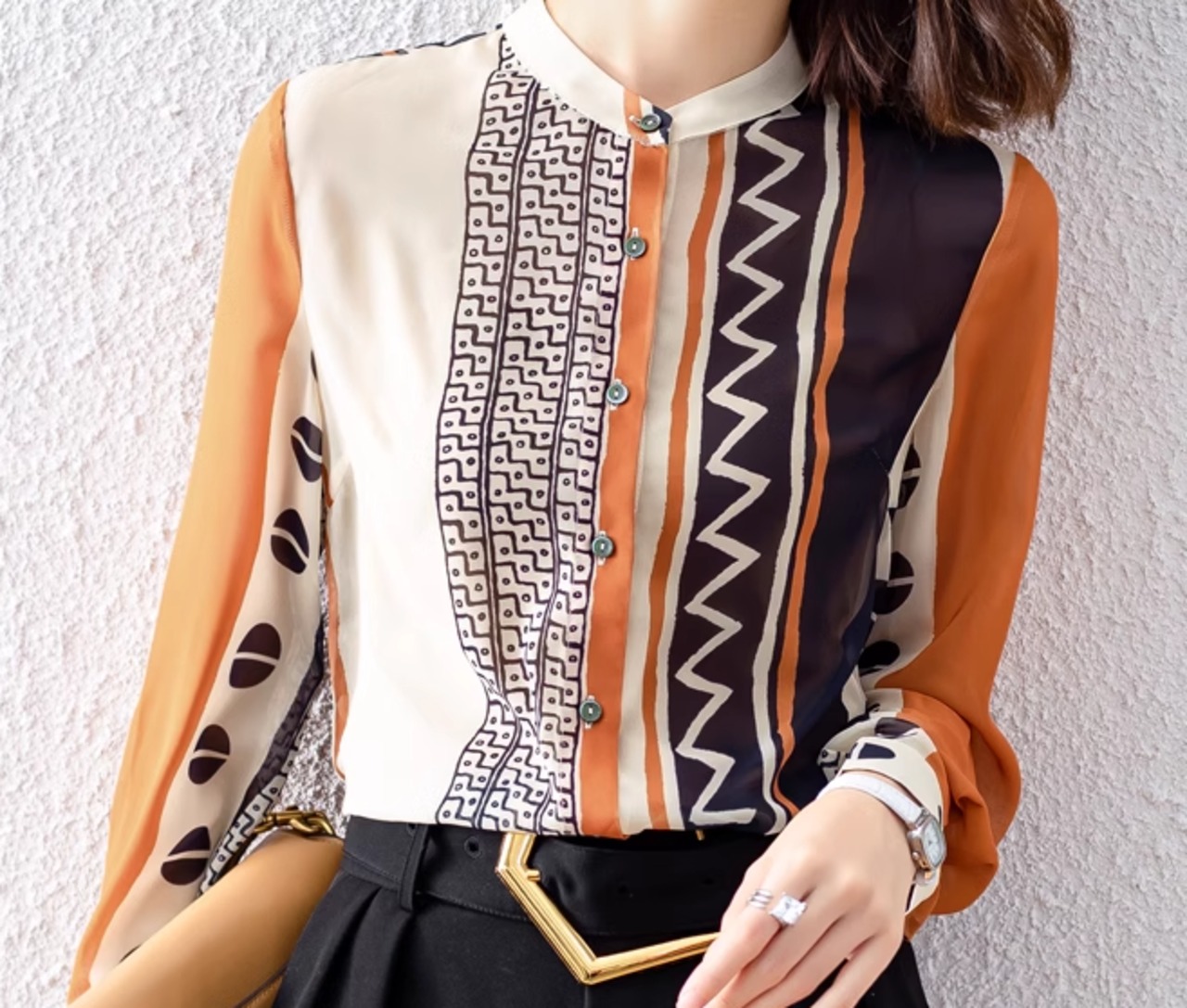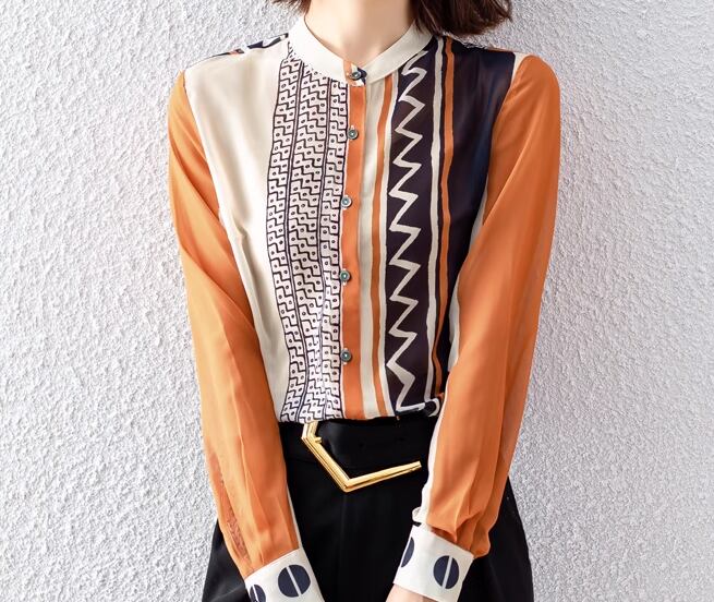 レディース シャツ ミドル丈 長袖 ラウンドネック スタンドカラー シフォン 異国風 ボタン 大人可愛い カジュアル 上品 おしゃれ かっこいい レトロ こなれ感 個性的 クール エレガント モダン 存在感 ラグジュアリー 派手 知的 ハンサム 高級感 芸術的 アーティスティック スタイリッシュ 高貴 プリント 秋 OL 通勤 デート お出かけ 普段使い 着回し S M L XL オレンジ 大人デザイン