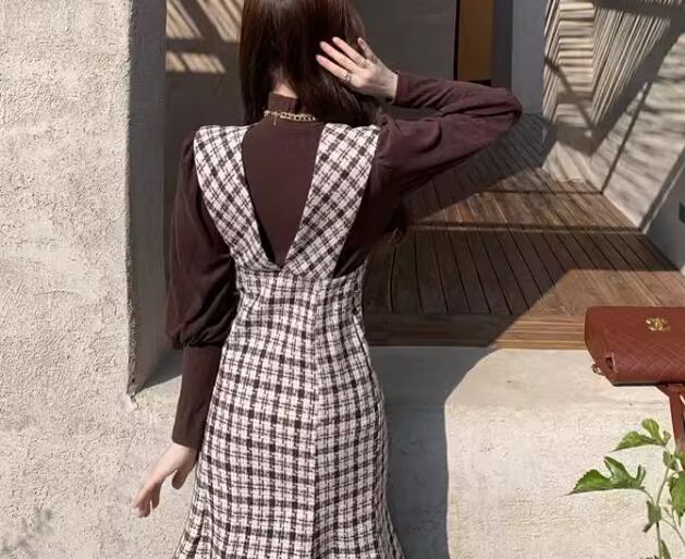 無地の長袖トップスとチェック柄のレトロなノースリーブワンピースの二点セット。