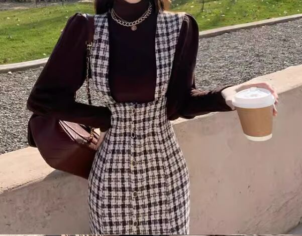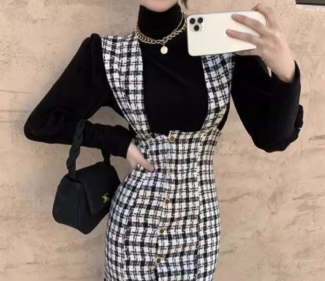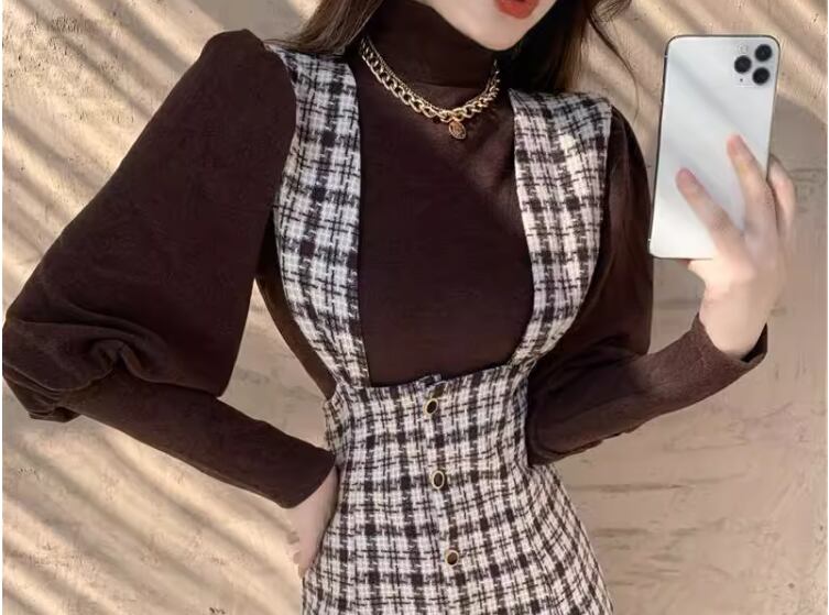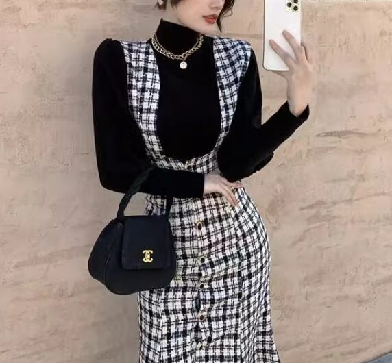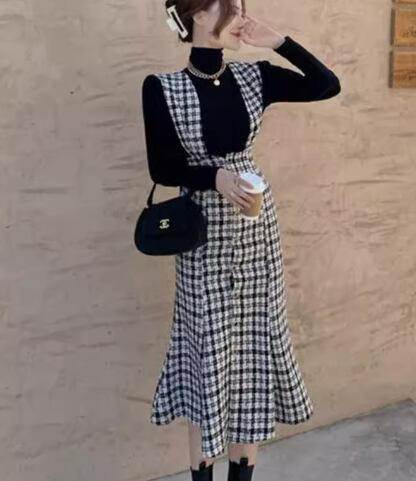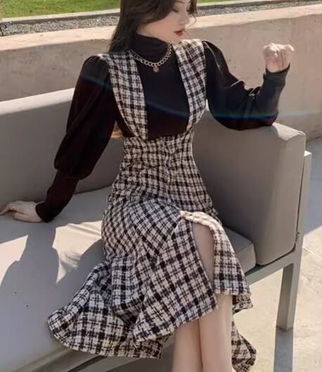 二点セット ツーピース レディース トップス ワンピース セットアップ ミモレ 長袖 マーメイド 異国風 かわいい 大人可愛い きれいめ 上品 おしゃれ レトロ ガーリー エレガント キュート クラシカル 知的 シック 高級感 無地 チェック 春 秋 デート お出かけ 旅行 レストラン 重ね着 普段使い 着回し レイヤード モテ 清楚 S M L XL ブラック 大人デザイン