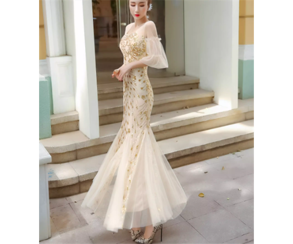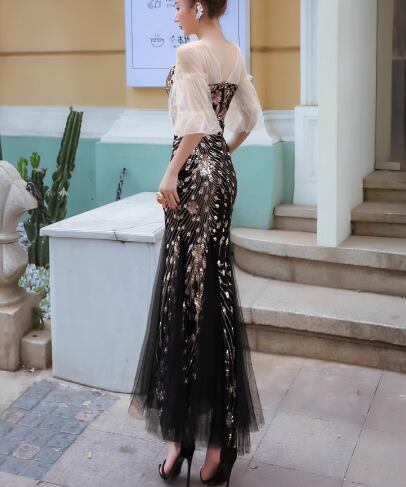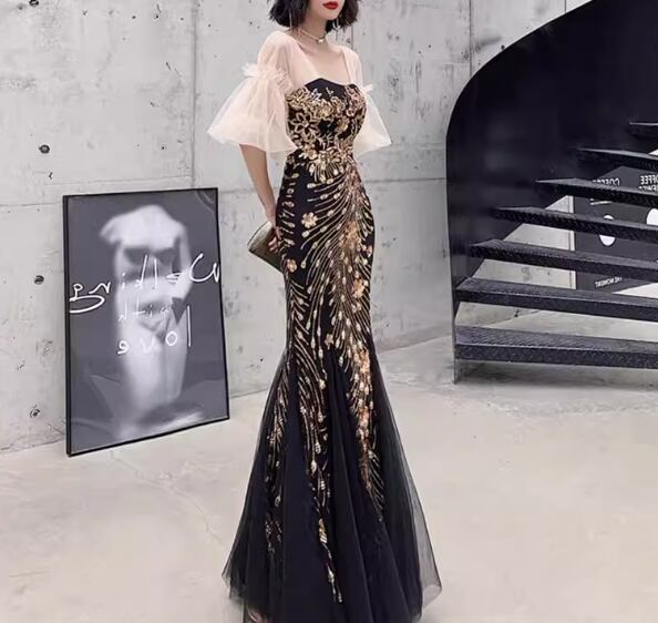 シックなカラーとスタイリッシュなデザインが魅力的なイブニングドレス。