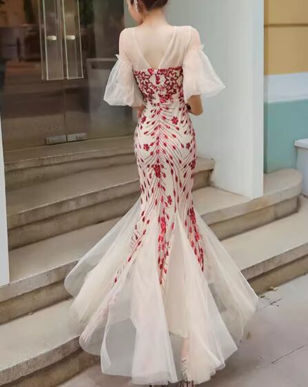 背中開きデザイン×フィッシュテールで女性らしさとセクシーさを演出できます。
