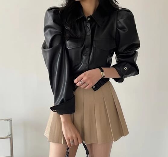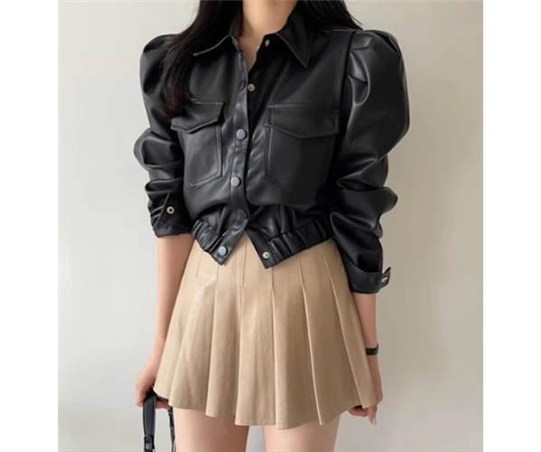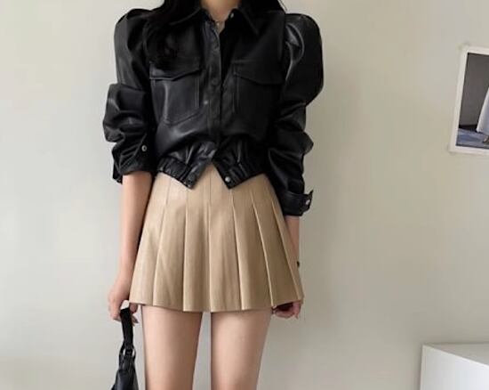 ショート丈のレザージャケットとプリーツが可愛いミニスカートの二点セット。
