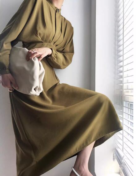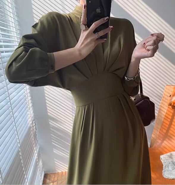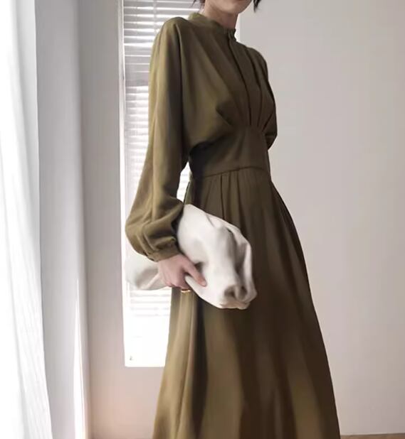 レディース ワンピース ドレス ロング 長袖 スタンドカラー ウエストマーク 大人可愛い きれいめ シンプル カジュアル 上品 おしゃれ レトロ クール エレガント クラシカル ナチュラル 知的 清潔感 シック 高級感 スタイリッシュ 無地 秋 デート お出かけ パーティー イベント レストラン 女子会 休日 ホテル 普段使い 清楚 S M L XL ブラック グリーン 大人カラー 秋カラー 大人デザイン