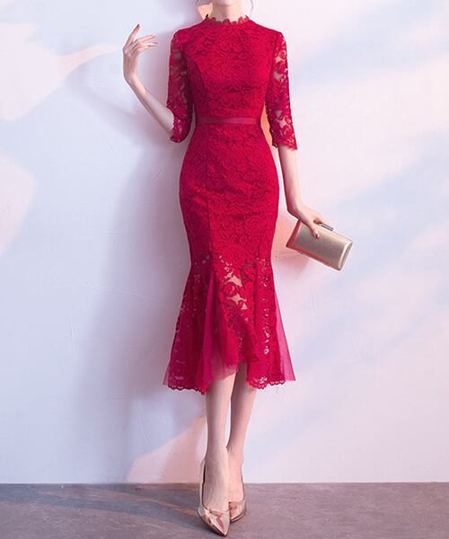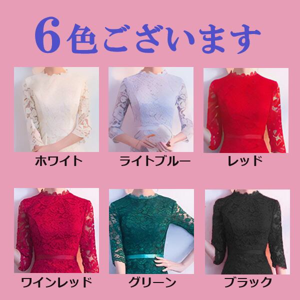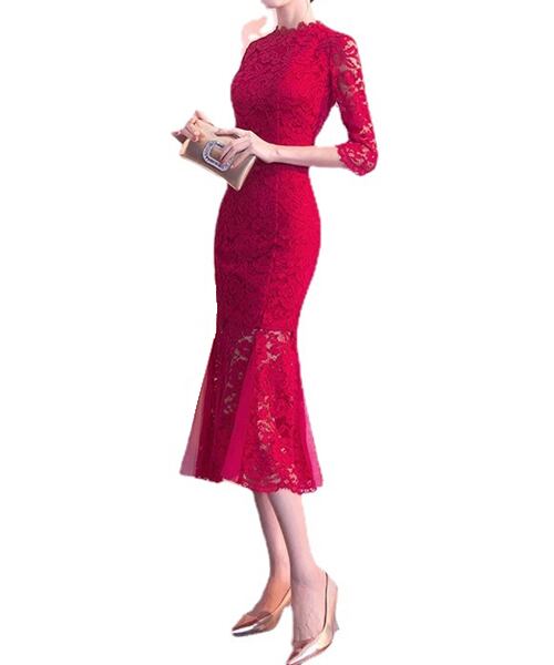 全6色・5サイズ レディーストーストドレス プチレースフィッシュテールドレス チャイナドレス イブニングドレス シンプル パーティードレス クルーネック 花柄 タイト マキシ 七分丈 ミディアム パイピング七分袖 エレガント ロング ラウンドラペル ワンピース ドレス タイト マーメイド フェミニン レース 薄手 上品 シーズンレス 10代 20代 パーティー