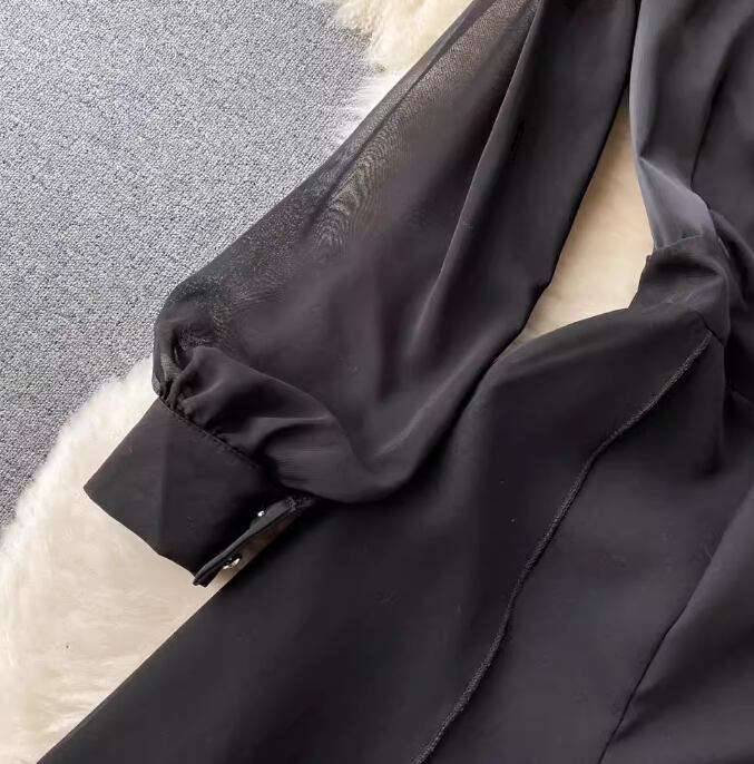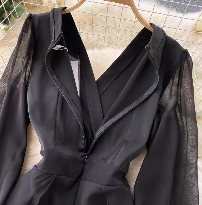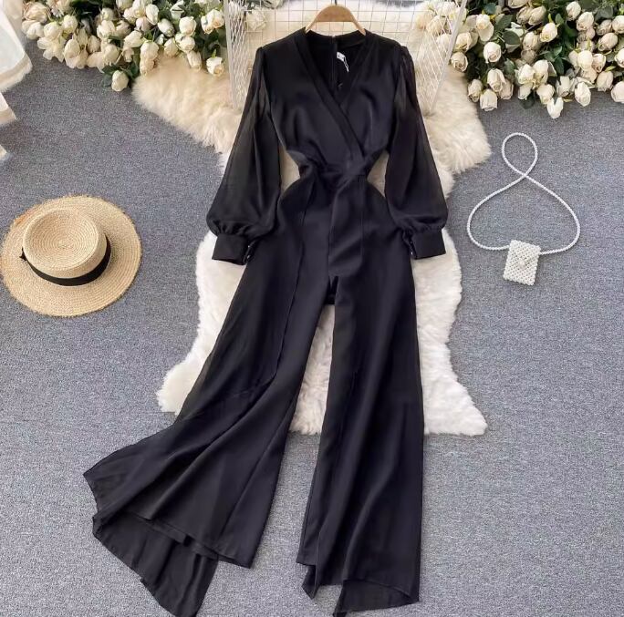 Vネックのデザインや裾のワイドなパンツが女性らしさを引き立てます。シースルーのチュールやシフォン素材が透け感を演出し、上品さも兼ね備えています。ウエストのマークでスタイルアップ効果も期待でき、脚長効果もあります。さらに、ビジューボタン付きのディテールにより、存在感も抜群です。