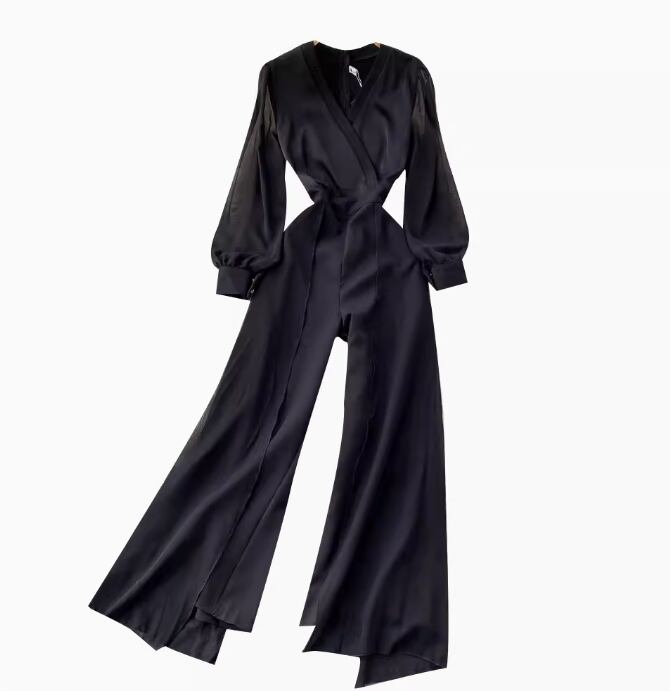 レディース オールインワン ドレス ストレートパンツ ワイドパンツ マキシ 長袖 Vネック カシュクール 裾ワイド フェミニン チュール シフォン ウエストマーク 透け感 シースルー 薄手 ビジュー きれいめ シンプル 上品 おしゃれ 個性的 クール モード系 主役級 存在感 ラグジュアリー 無地 夏 ママ OL 通勤 お出かけ パーティー イベント リゾート 旅行 レストラン 休日 バカンス ホテル 体型カバー 美脚 脚長 トレンド インスタ映え S M L XL 黒 ブラック