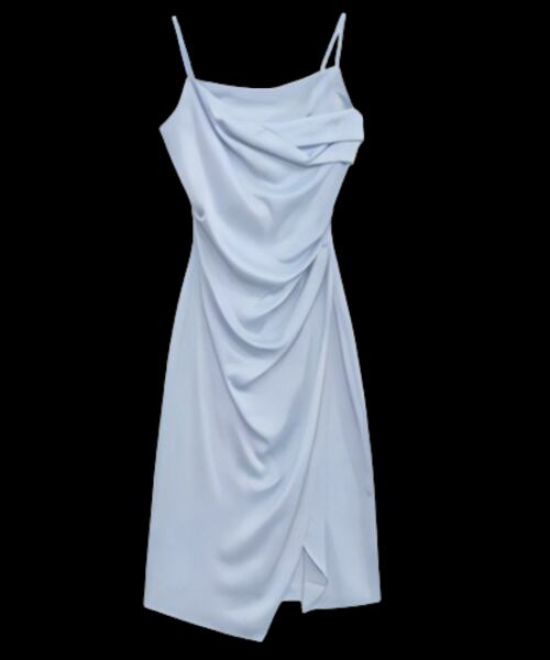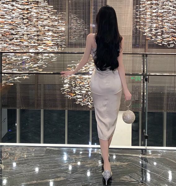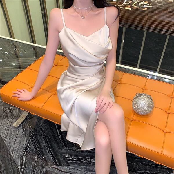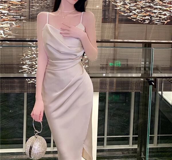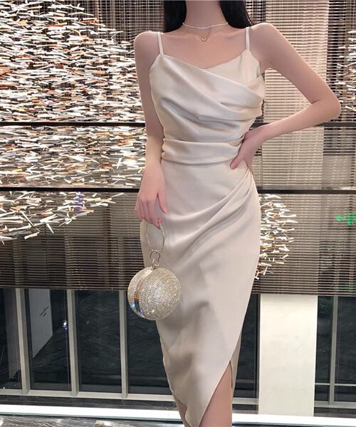 2色展開 レディース ワンピース ドレス 膝下 タイト スリム アシンメトリー フェミニン 大人可愛い きれいめ 上品 エレガント 春 夏 10代 20代 お出かけ パーティー ショッピング 重ね着 無地 ハイウエスト ミドル ノースリーブ サスペンダー ニッチスカート ヒップハグスカート サテン Hライン