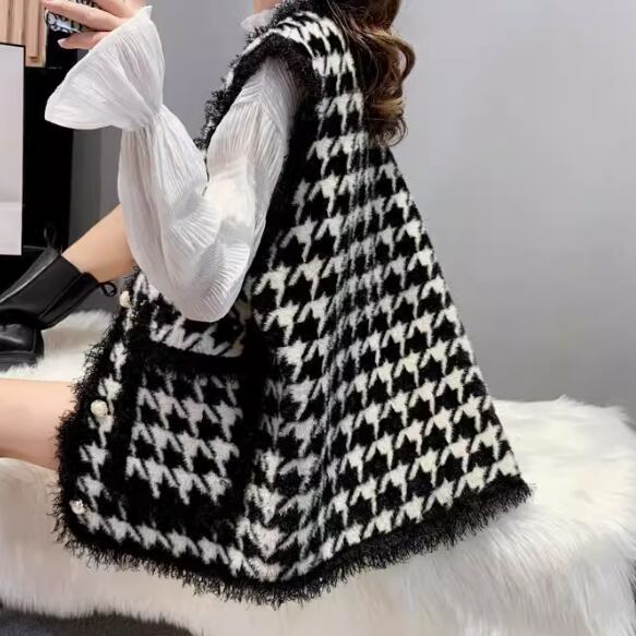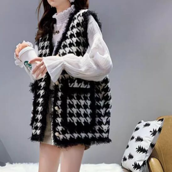 レディース ジャケット ニット ベスト アウター 上着 羽織 前開き 丈長 袖なし ノースリーブ 襟なし もこもこ ふわふわ ふっくら ポケット 伸縮性 ボタン かわいい 大人可愛い きれいめ シンプル カジュアル 上品 おしゃれ かっこいい レトロ アジアン こなれ感 ラフ ルーズ 個性的 クール エレガント モダン 主役級 存在感 とろみ感 抜け感 ラブリー キュート 都会的 ベーシック ロマンティック 千鳥格子 春 秋 お出かけ 休日 お花見 重ね着 コーデ 体型カバー 普段使い ゆったり ゆる