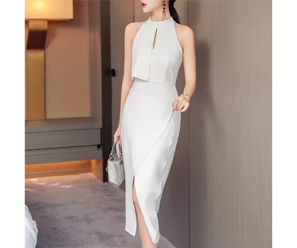 レディース ドレス ミモレ 袖なし ノースリーブ ホルターネック スタンドカラー タイト スリム 細身 背中開き スリット ファスナー ハイウエスト 大人可愛い きれいめ シンプル 上品 おしゃれ かっこいい こなれ感 クール エレガント ラグジュアリー 知的 セクシー ハンサム シック 高級感 芸術的 アーティスティック スタイリッシュ 無地 夏 デート お出かけ パーティー イベント モテ L XL 大きいサイズ 小さめ ホワイト 大人デザイン