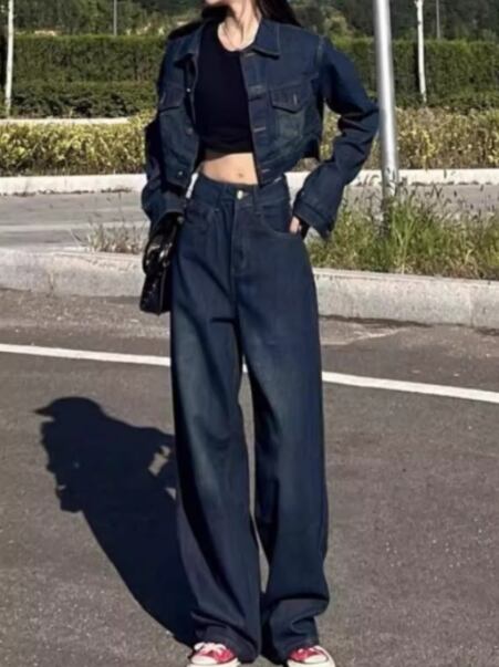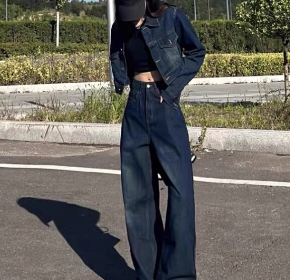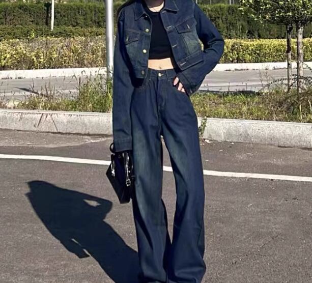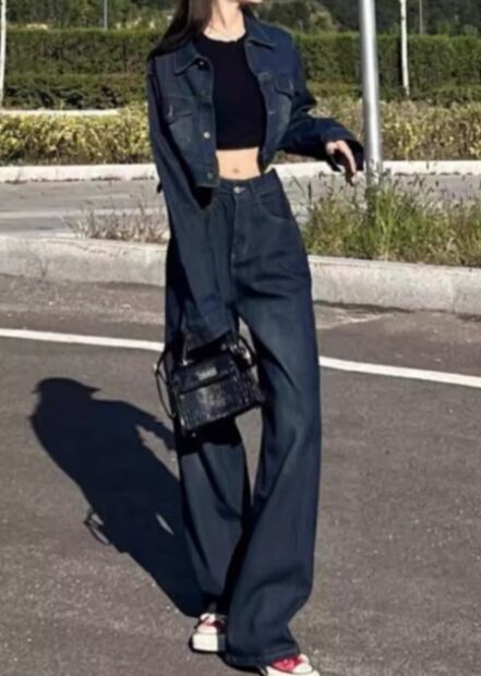 二点セット 上下セット ツーピース レディース ジャケット パンツ ボトムス セットアップ デニム デニムジャケット Gパン ジーンズ 丈長 フルレングス 長袖 襟付き ワイド 大人可愛い シンプル カジュアル おしゃれ かっこいい こなれ感 メンズライク ボーイッシュ ルーズ クール ラグジュアリー ワイルド ハンサム シック 高級感 スタイリッシュ 無地 秋 デート お出かけ 普段使い 着回し S M L XL ネイビー