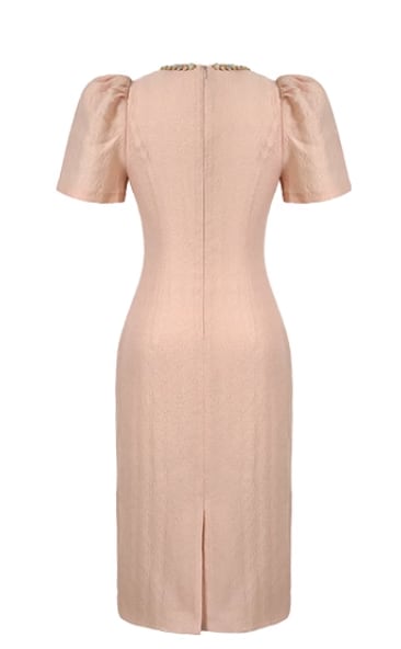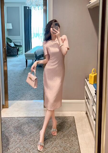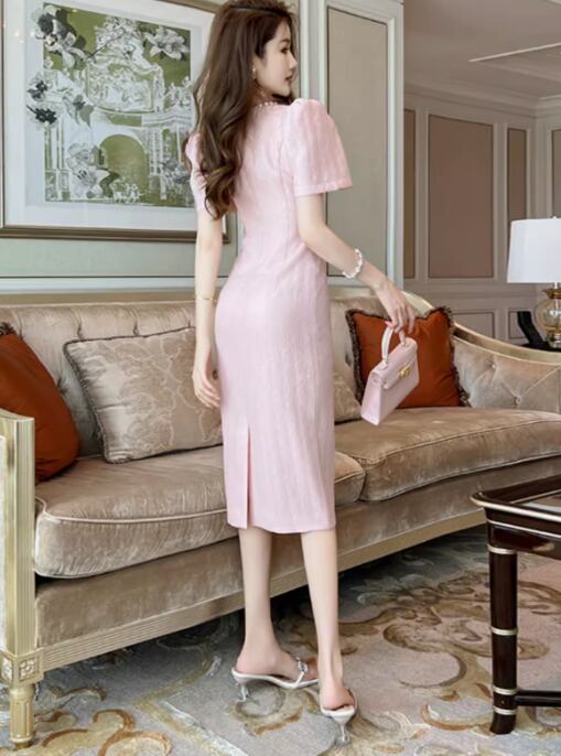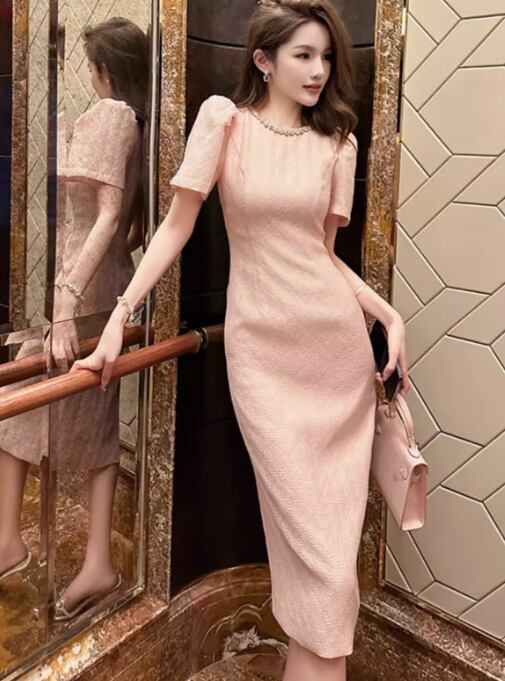 レディース ワンピース ドレス ドレス ミディアム タイトスカート 膝丈 ミモレ 半袖 ボリューム袖 ラウンドネック タイト 細身 ウエストマーク スリット バックスリット ハイウエスト 薄手 大人可愛い きれいめ 上品 おしゃれ エレガント 主役級 存在感 クラシカル ロマンティック 無地 夏 パーティー イベント リゾート 旅行 レストラン 休日 バカンス ホテル ショッピング 発表会 コンサート 合コン コンパ モテ 清楚 インスタ映え S M ピンク