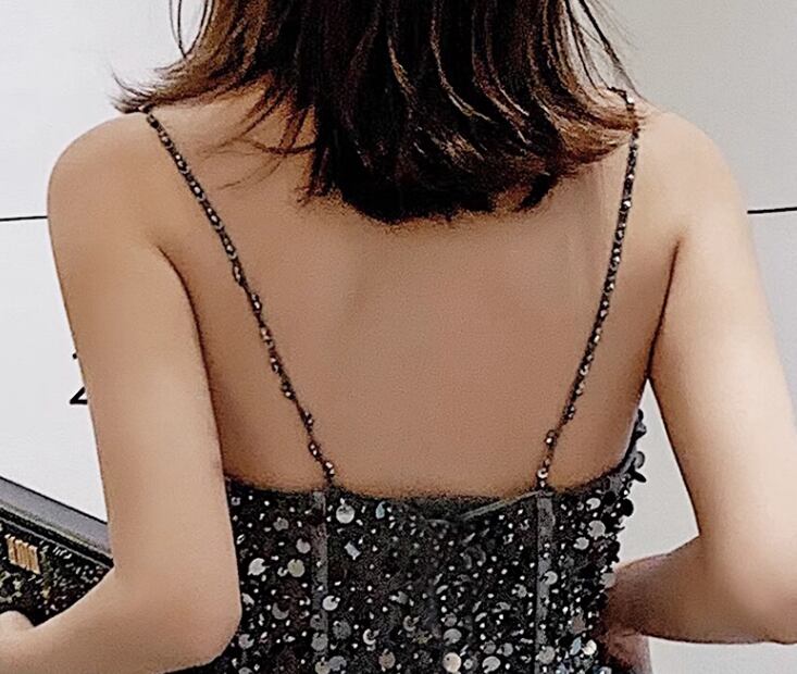プリンセスラインのデザインと、スパンコールのディテールが、エレガントで女性らしさを引き立てます。