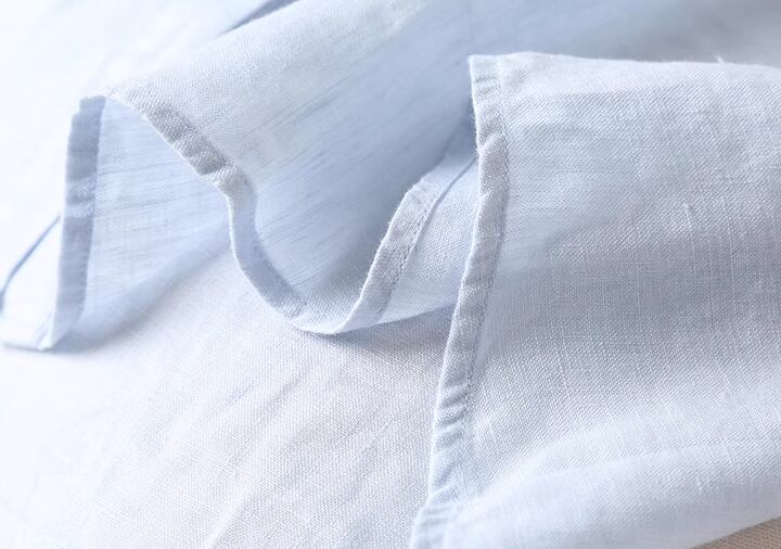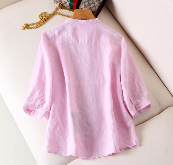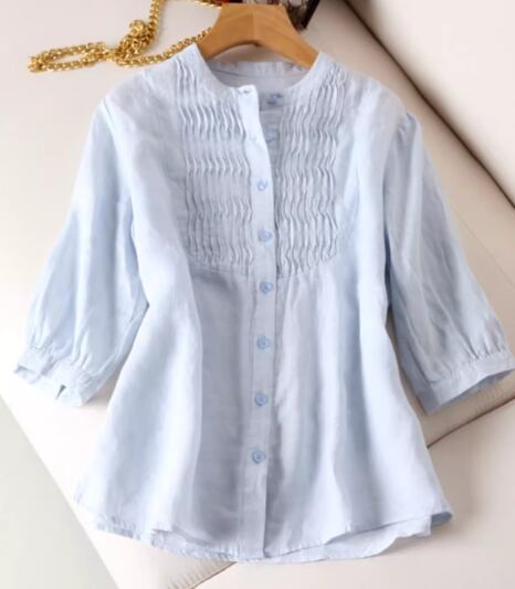 優しげな淡い色味が魅力的な七分袖のリネンシャツ。