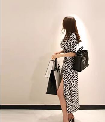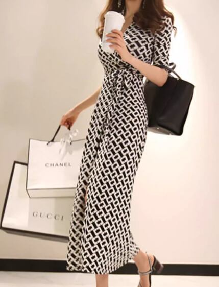レディース ワンピース プルオーバー ドレス ロング マキシ 5分袖 Vネック タイト スリム 細身 Aライン ウエストマーク スリット ハイウエスト 大人可愛い きれいめ 上品 おしゃれ かっこいい こなれ感 個性的 クール エレガント モダン 存在感 ラグジュアリー セクシー シック 高級感 スタイリッシュ プリント 夏 OL デート お出かけ モノトーン 普段使い モテ S M L XL 小さめ ブラック 大人デザイン