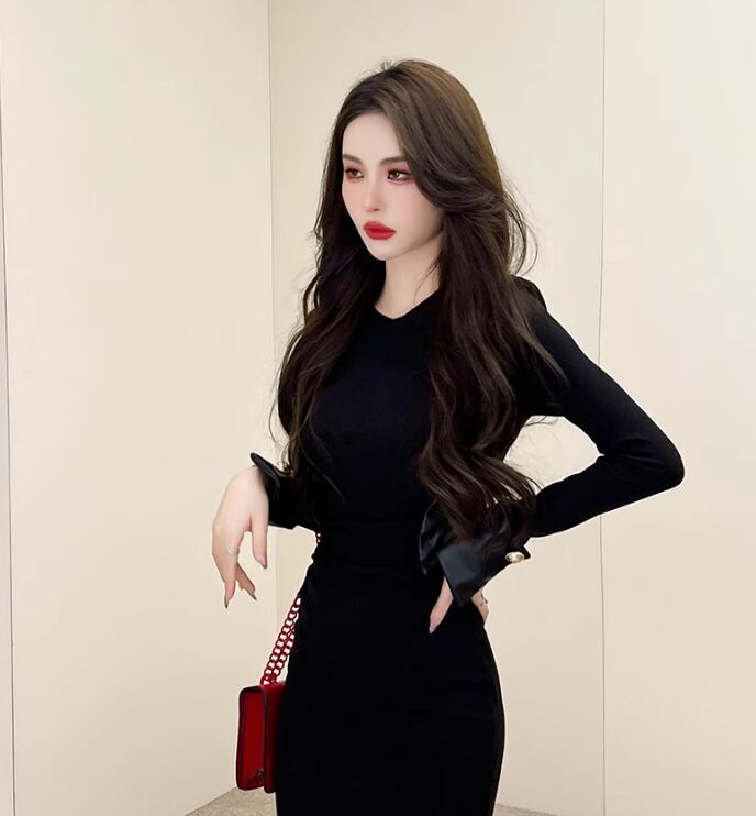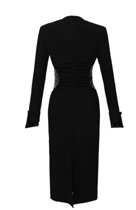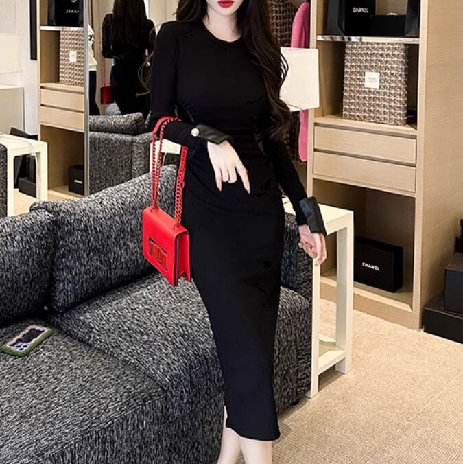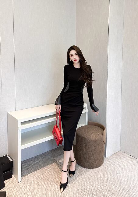 レディース ワンピース ドレス タイトスカート 膝下 ミモレ 長袖 ラウンドネック タイト スリム 細身 切り替え フェミニン ウエストマーク ハイウエスト 伸縮性 切り替えデザイン 薄手 異素材ミックス ストレッチ シンプル 上品 おしゃれ かっこいい 個性的 クール エレガント 主役級 存在感 都会的 ラグジュアリー 無地 秋 謝恩会 発表会 ママ デート お出かけ パーティー イベント ホテル ガーデン 合コン コンパ インスタ映え S M L XL ブラック