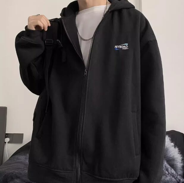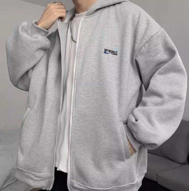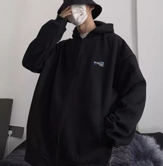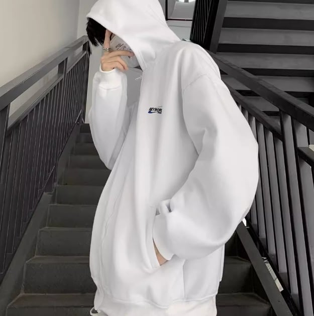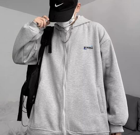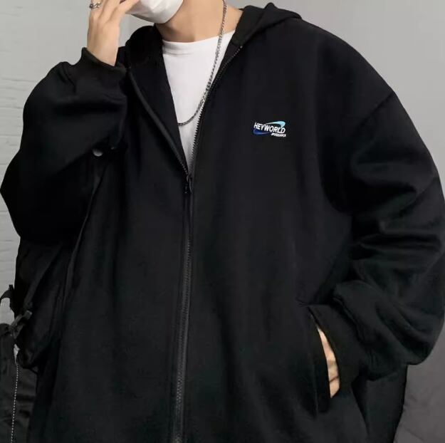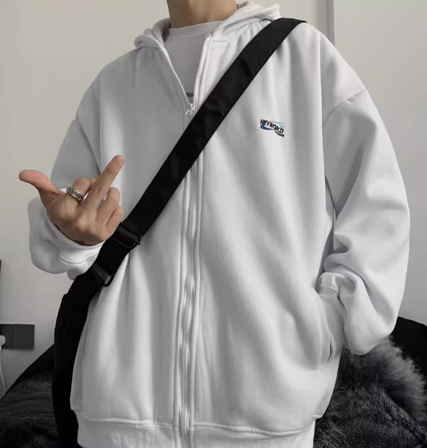 メンズ 男性用 パーカー ミドル丈 長袖 ストリート ヒップホップ ファスナー ポケット フード シンプル カジュアル かっこいい ラフ クール ハンサム シック スタイリッシュ 原宿ファッション プリント 文字 テキスト ワンポイント 春 秋 カップル 10代 20代 学生 デート お出かけ お揃い 韓国 普段使い 着回し トレンド 流行 S M L XL ホワイト ブラック グレー