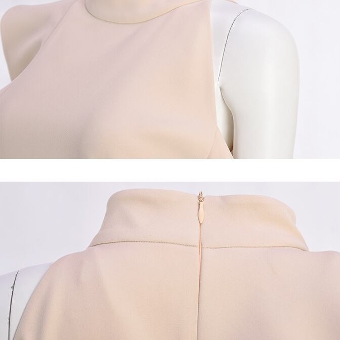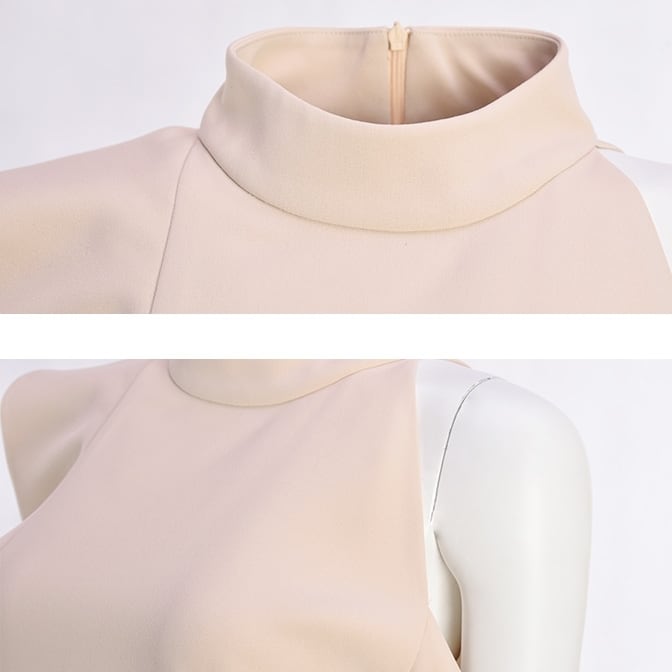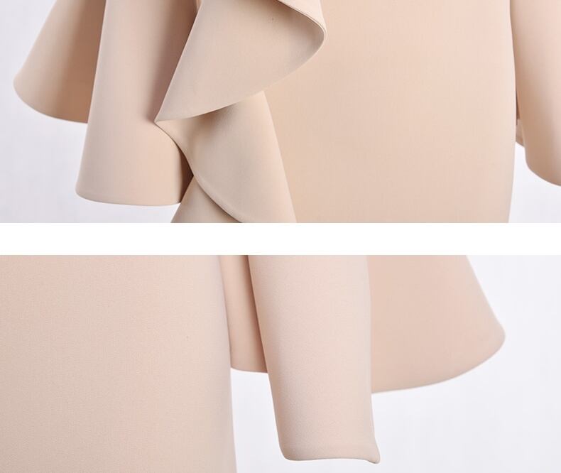 クルーネックとオフショルのデザインが上品な印象を与え、アシンメトリーのフリルが女性らしさを引き立てます。存在感を放つタイトなシルエットが、大人可愛いスタイルを演出。