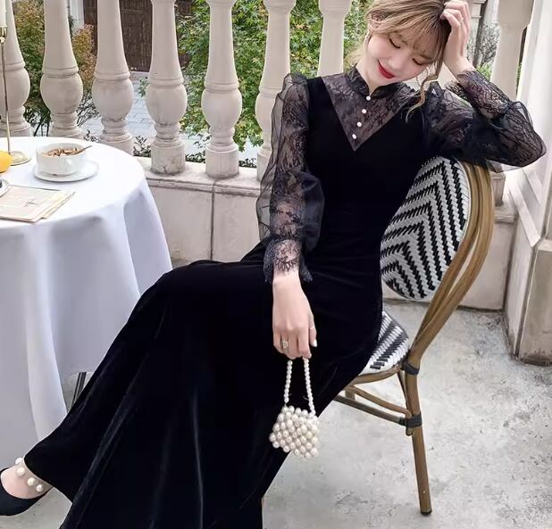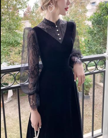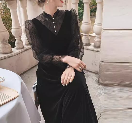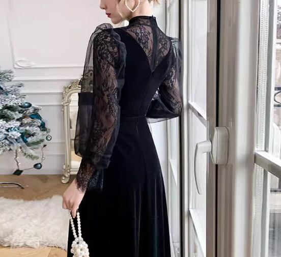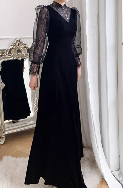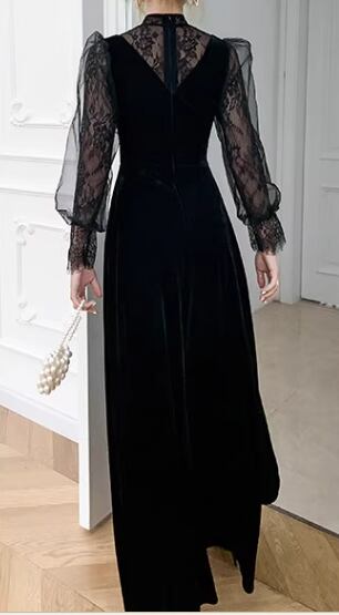 レディース ドレス イブニングドレス パーティードレス ロング マキシ 長袖 ボリューム袖 ランタンスリーブ ラウンドネック スリム 細身 Aライン ファスナー ベルベット 大人可愛い きれいめ 上品 おしゃれ レトロ ガーリー 個性的 エレガント 存在感 キュート ラグジュアリー クラシカル シック 高級感 芸術的 アーティスティック 華やか スタイリッシュ 秋 冬 デート お出かけ パーティー イベント XS S M L XL 小さいサイズ 小さめ ブラック