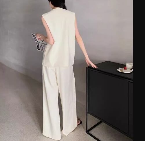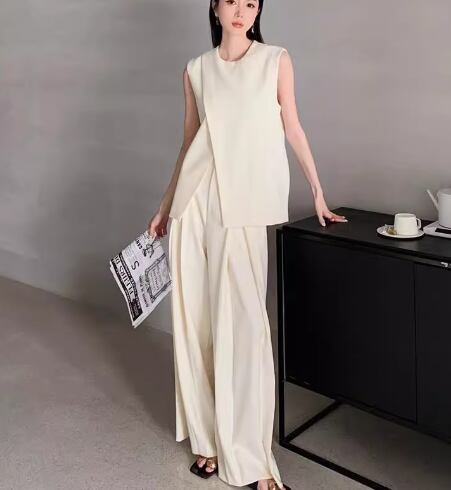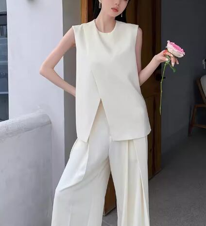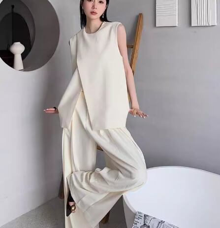 二点セット 上下セット ツーピース レディース トップス パンツ プルオーバー スーツ セットアップ ワイドパンツ フルレングス 袖なし ノースリーブ ラウンドネック ストレート ドレープ スリット ハイウエスト 大人可愛い きれいめ シンプル カジュアル 上品 おしゃれ かっこいい こなれ感 ルーズ クール エレガント ラグジュアリー ナチュラル ハンサム 無地 夏 OL 通勤 デート お出かけ 韓国 体型カバー 脚長 普段使い 着回し トレンド 流行 S M L ゆったり ゆる ブラック ベージュ