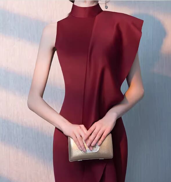 シックなカラーとスタイリッシュでモダンなデザインが魅力的なノースリーブのイブニングドレス。