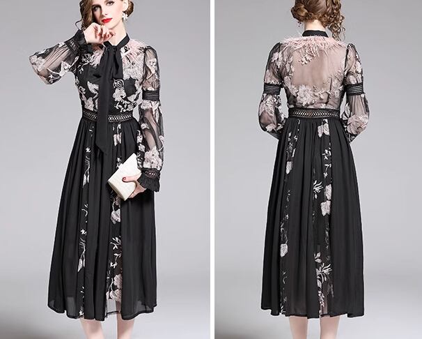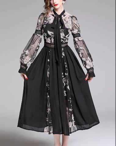 レディース プルオーバー ドレス パーティードレス ロング 長袖 ボリューム袖 ランタンスリーブ スタンドカラー りぼんタイ フレア 刺繍 フリル ウエストマーク ファスナー 切り替えデザイン 大人可愛い きれいめ 上品 おしゃれ レトロ ガーリー 個性的 エレガント 主役級 存在感 ラグジュアリー クラシカル シック 高級感 芸術的 アーティスティック 華やか スタイリッシュ 高貴 春 デート お出かけ パーティー イベント S M L XL ブラック