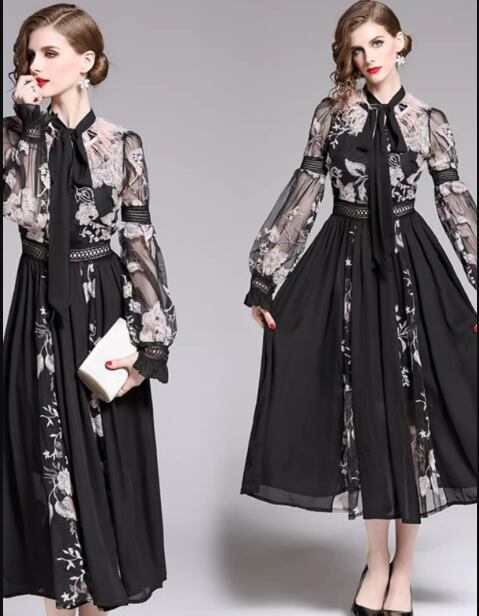 異国風のクラシカルなデザインが魅力的な長袖のロングドレス。