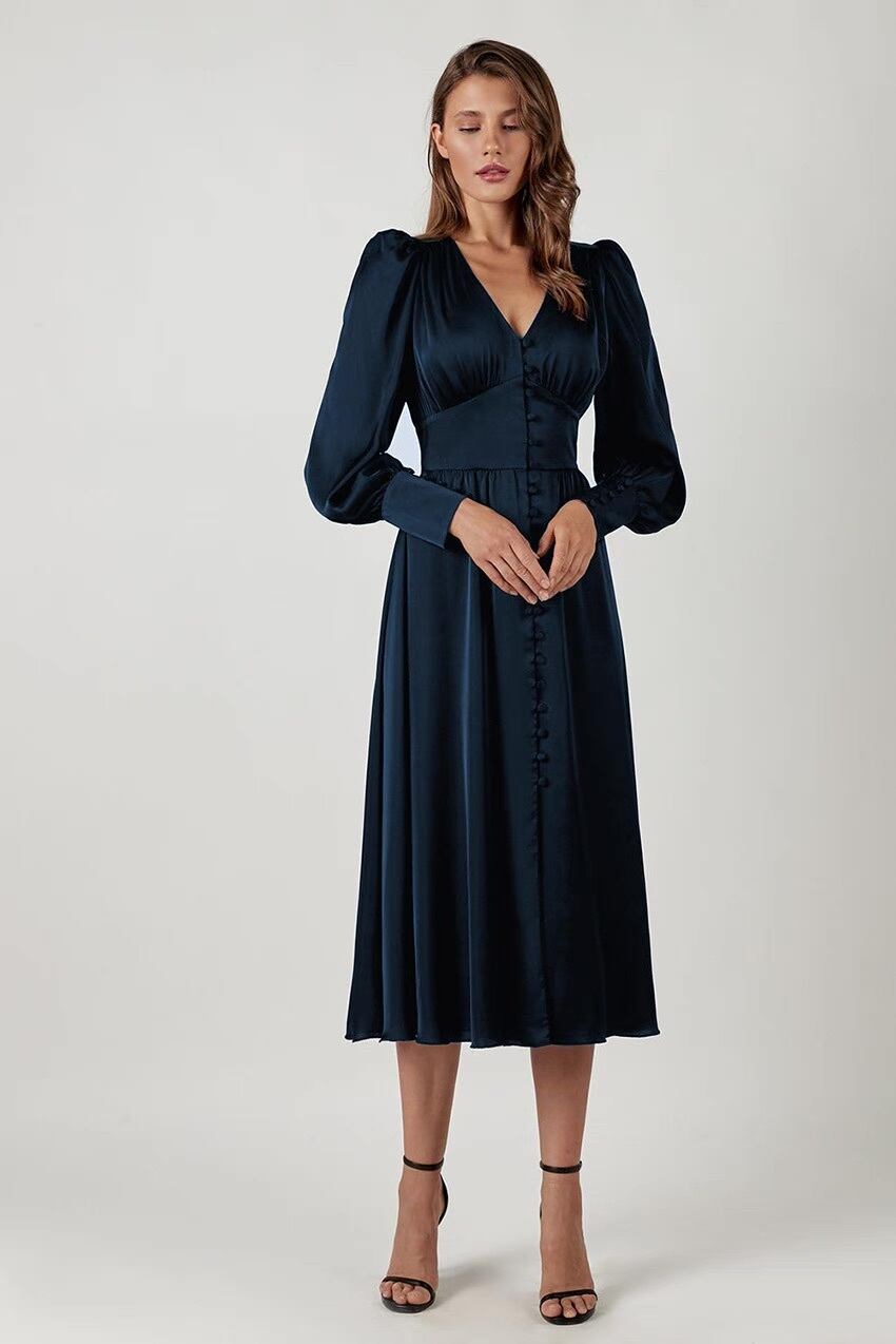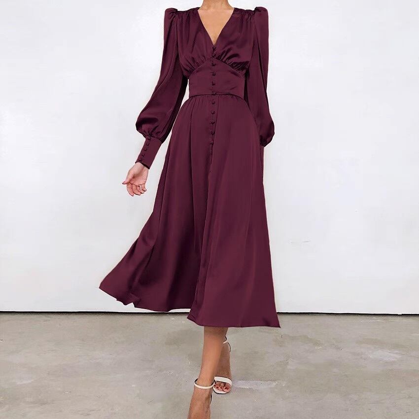 レディース ワンピース ロング 長袖 ボリューム袖 パフスリーブ Vネック フレア Aライン フェミニン ハイウエスト ヴィンテージ サテン シンプル カジュアル おしゃれ かっこいい クール 存在感 抜け感 ラブリー キュート 都会的 ラグジュアリー ロマンティック 無地 春 秋 デート お出かけ パーティー イベント 休日 普段使い 着回し モテ 清楚 トレンド 流行 インスタ映え M L XL 白 ホワイト 黒 ブラック 紫 茶色 ブラウン ベージュ ブルー 光沢 メタリック ネイビー 緑 グリーン