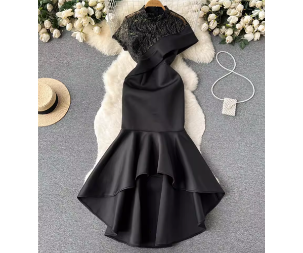 レディース プルオーバー ドレス イブニングドレス ミモレ 不規則 半袖 Aライン レース 刺繍 ファスナー ハイウエスト 切り替えデザイン 大人可愛い きれいめ 上品 おしゃれ かっこいい こなれ感 個性的 クール エレガント モダン 主役級 存在感 ラグジュアリー セクシー シック 高級感 芸術的 アーティスティック 華やか スタイリッシュ 夏 デート お出かけ パーティー イベント S M L XL ブラック