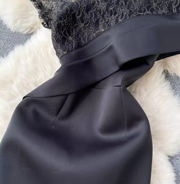 繊細で上品なレースと刺繍が魅力的な黒のイブニングドレス。