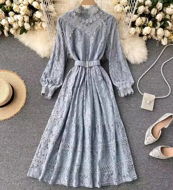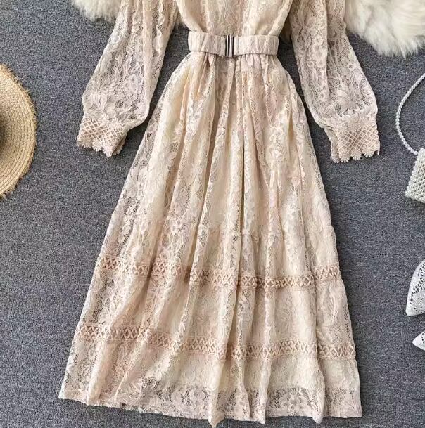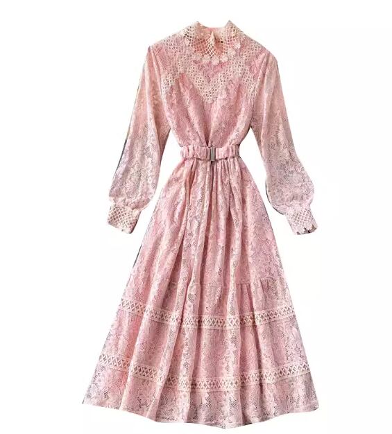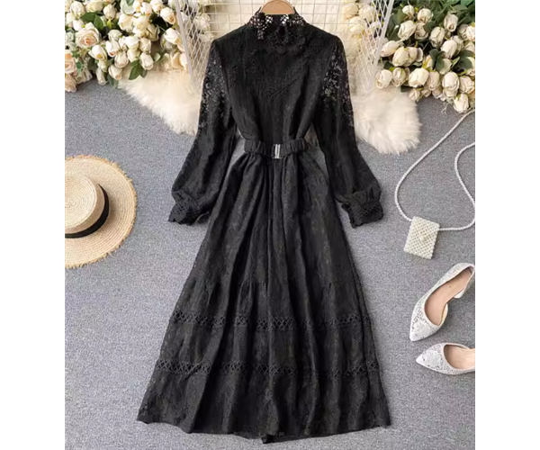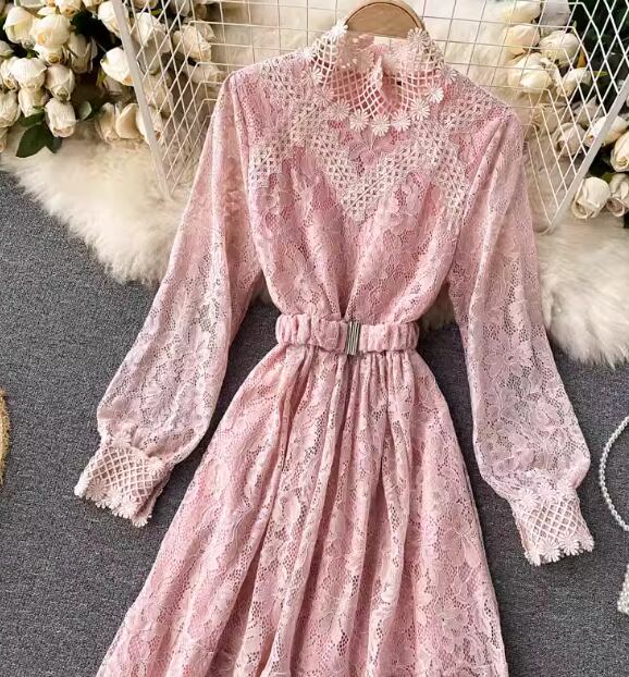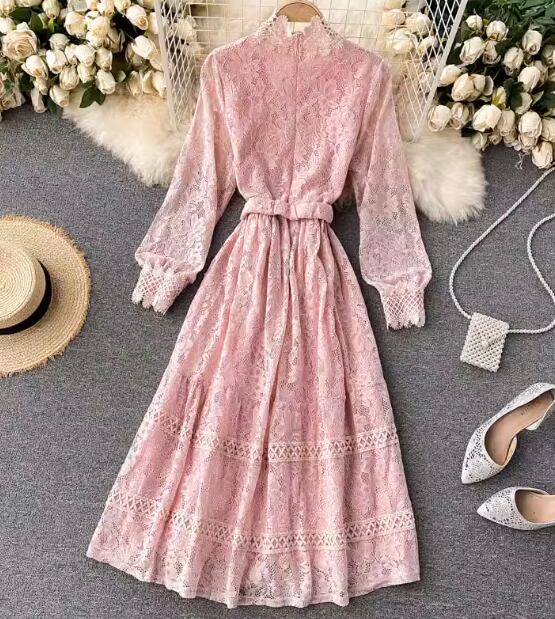 レディース ワンピース プルオーバー ドレス ミドル丈 長袖 パフスリーブ ラウンドネック スタンドカラー Aライン フェミニン レース ベルト ウエストマーク ハイウエスト かわいい 大人可愛い きれいめ 上品 おしゃれ レトロ ガーリー エレガント 主役級 ラブリー キュート クラシカル シック 高級感 優しい フェアリー 秋 冬 10代 20代 学生 デート お出かけ 普段使い 清楚 フリーサイズ ブラック ピンク ブルー アプリコット