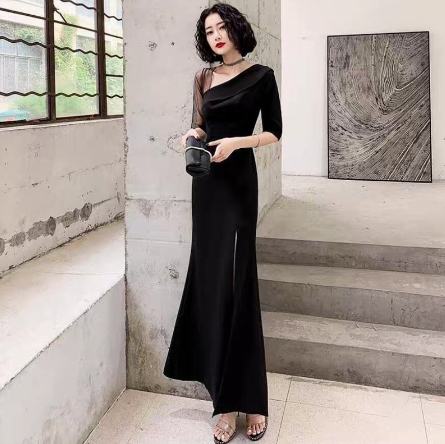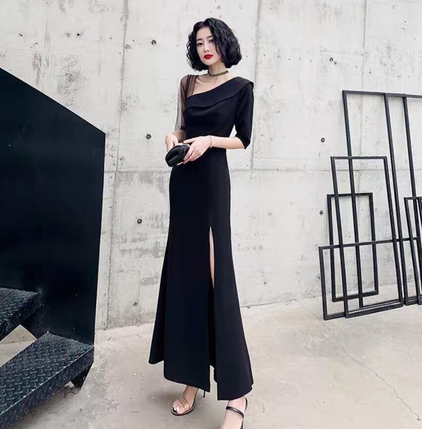 ドレス ワンピース ウェディング パーティー ステージ フォーマル マキシ 5分袖 ラウンドネック ワンショル アシンメトリー フレア Aライン イブニング 切り替えデザイン ハイウエスト 透け感 シースルー 薄手 上品 おしゃれ かっこいい クール モード エレガント モダン フォーマル 抜け感 クラシック ゴージャス エレガント セクシー シック パーティー イベント 体型カバー 二の腕カバー 美脚 脚長 高見え 格上げ 春 夏 秋 XS 2XL 3XL S M L XL スリム 黒 ブラック レッド