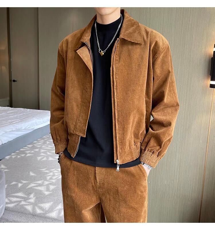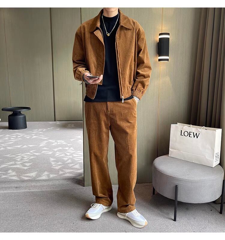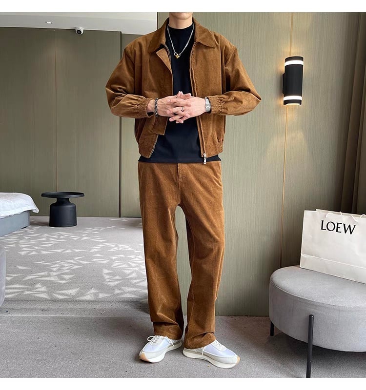ジャケット パンツ ボトムス セットアップ ストレートパンツ ロングパンツ フルレングス 長袖 襟付き 角襟 ストリート リブ 前開き コーデュロイ きれいめ シンプル カジュアル 上品 おしゃれ かっこいい レトロ こなれ感 ラフ メンズライク マニッシュ ボーイッシュ ルーズ クール ベーシック アメリカン カントリー アクティブ 無地 秋 冬 デート お出かけ イベント 休日 楽ちん 体型カバー 普段使い 着回し レイヤード モテ トレンド 流行 インスタ映え 定番 M L XL 茶色 ブラウン