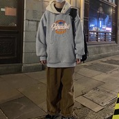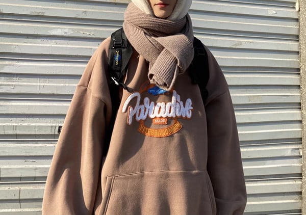 ラムウールフード付きスウェットシャツ。大き目サイズでシンプルデザイン、胸元のロゴパッチが可愛い“メンズ”です。女性がお召しになれば可愛いさも更に増すのでは‥‥ 快適さとスタイルを両立させたアイテムで、カジュアルな装いが楽しくなる一着です。