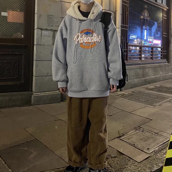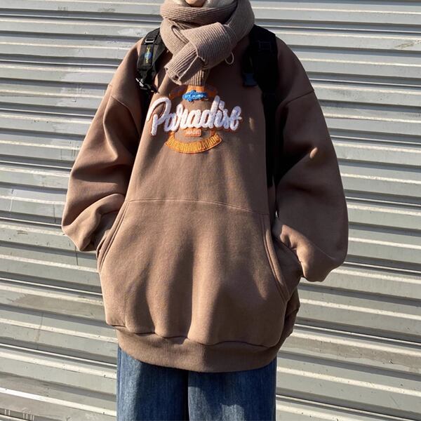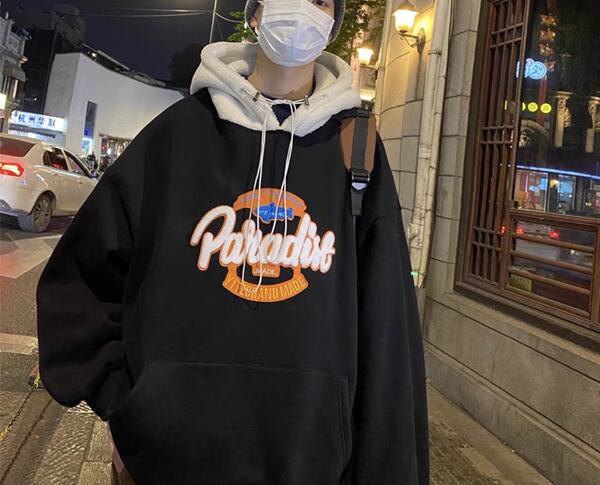 3色展開 メンズラムウールフード付きスウェットシャツ パーカー スウェット ジャージ 長袖 フード ワイド Aライン オーバーサイズ ふっくら ポケット ドロスト 中厚手 かわいい カジュアル おしゃれ ロゴ 春 秋 冬 男女兼用 10代 20代 学生 アウトドア ガーデン ライブ M L XL 2XL 大きいサイズ ゆったり ブラック ブラウン グレー