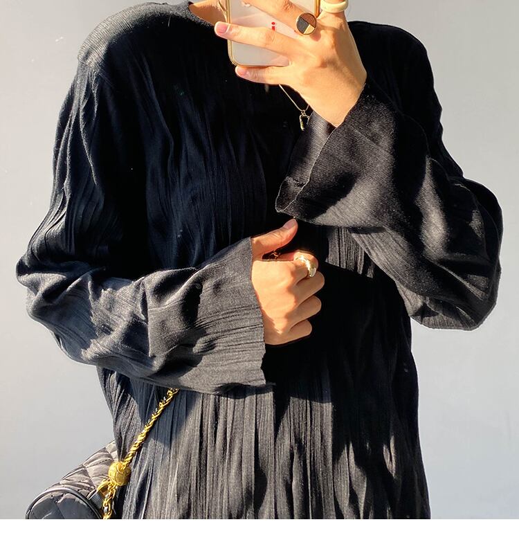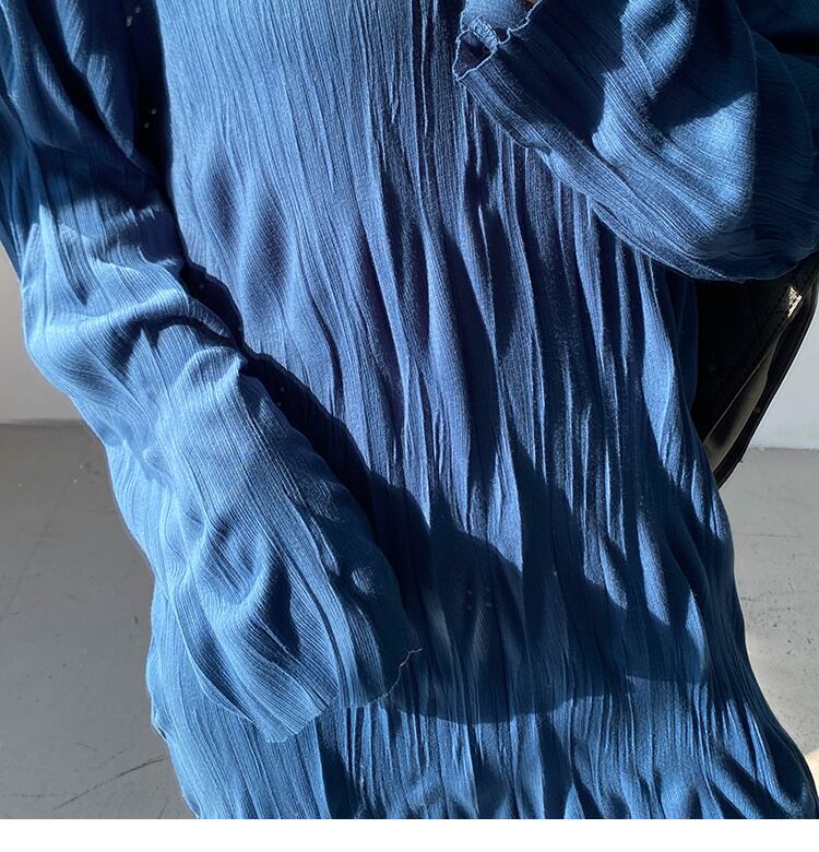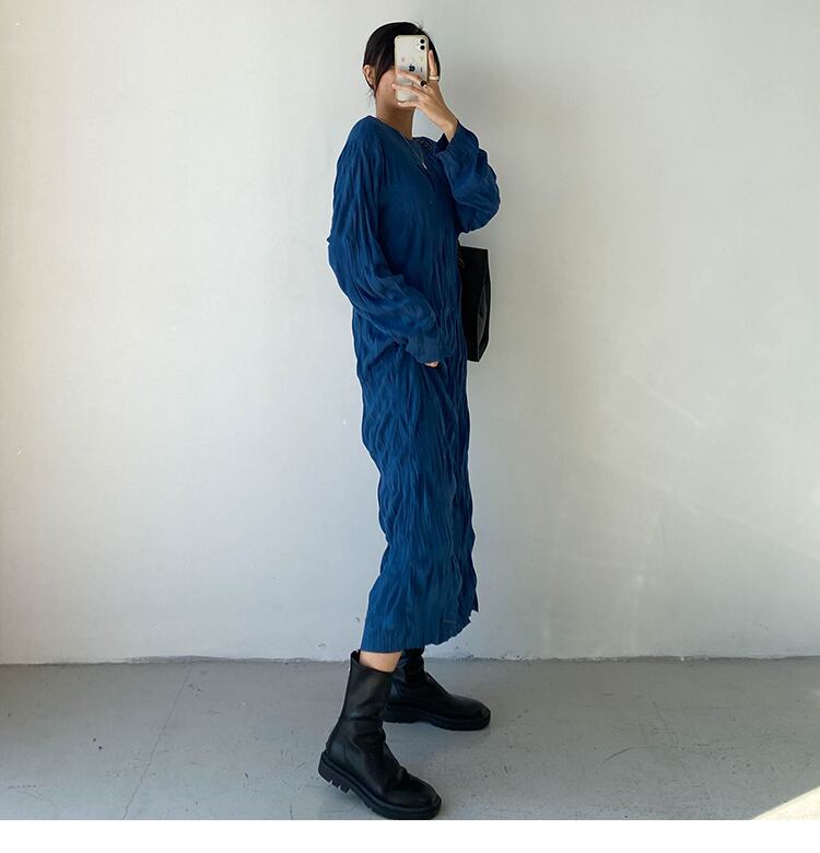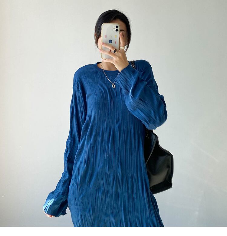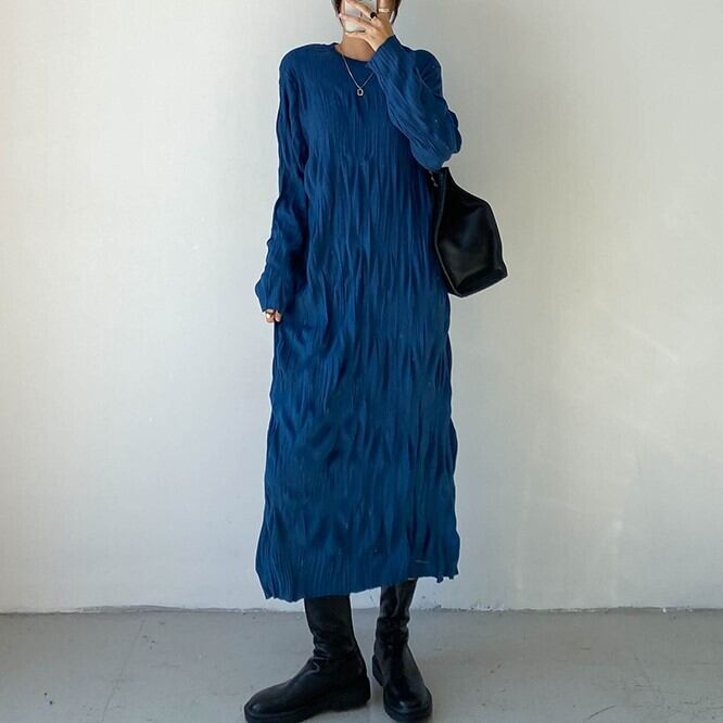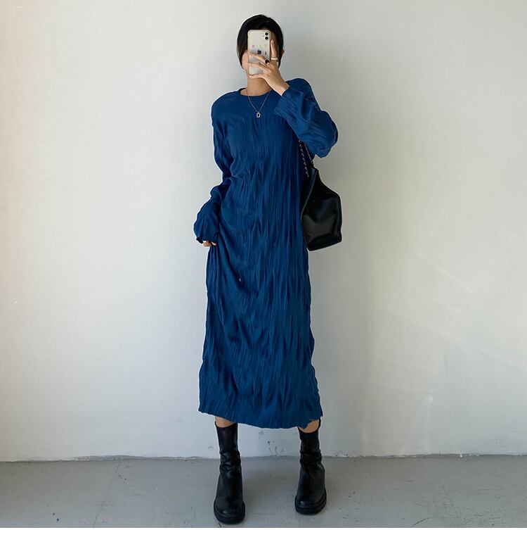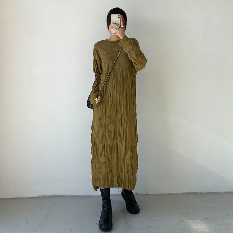ランダムシワ加工 シワプリーツ レディース ワンピース 膝下 ミモレ ロング 長袖 ドロップショルダー 萌袖 クルーネック 襟なし ストレート Iライン かわいい 大人可愛い きれいめ シンプル カジュアル 上品 おしゃれ こなれ感 ルーズ 個性的 無地 春 秋 冬 ママ 女の子 学生 学校 通学 デート お出かけ 旅行 女子会 休日 ショッピング カフェ 韓国 オルチャン コーデ 体型カバー 普段使い L XL 2XL 3XL 大きいサイズ ゆったり 黒 ブラック ゴールド ピーコックブルー カラバリ