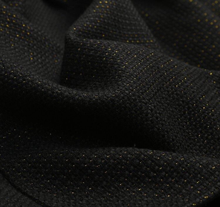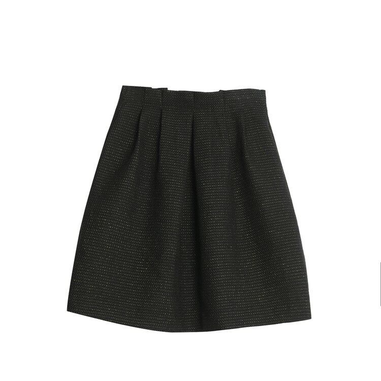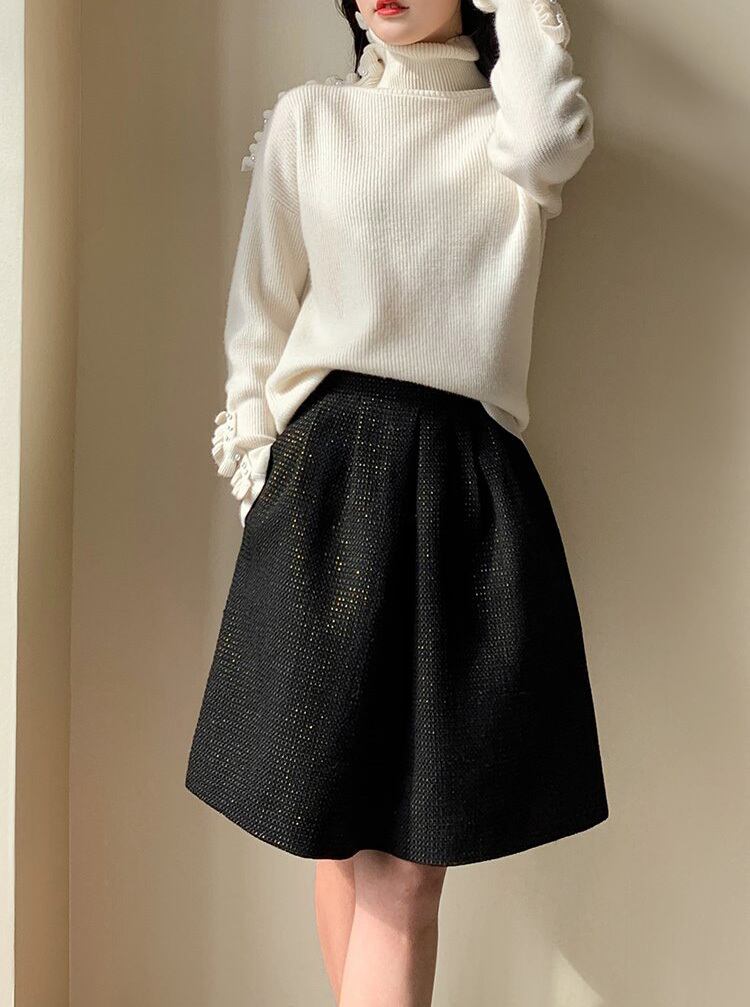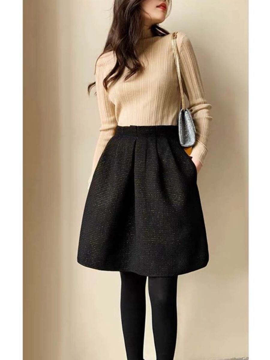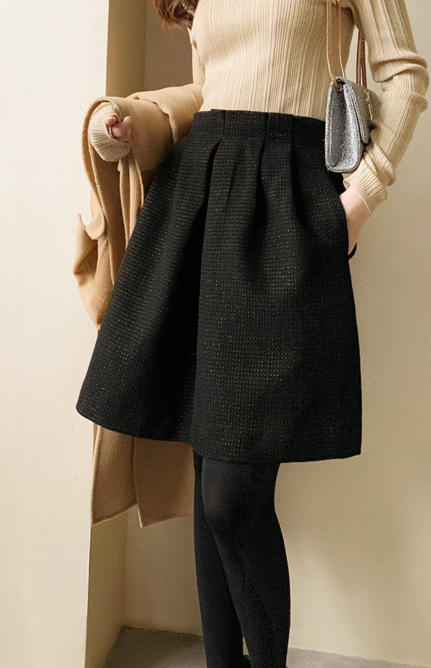 ウエスト下にタックを入れて立体感を出したタックフレアスカートです。黒地にゴールド系の糸が点状に見える生地で、細いボーダー風の見た目。膝上~膝ぐらいのミディアム丈で、パンプス~ロングブーツまで色々な丈感の靴を合わせられます。軽やかさと上品さを兼ね備えた丈感なので、オフィスユース~デートまで色々なシーンで着まわしがきくのも魅力です。後ろ姿はすっきりめでフロントのみ立体感があり、シンプルだけどありきたりにならない着こなしに。