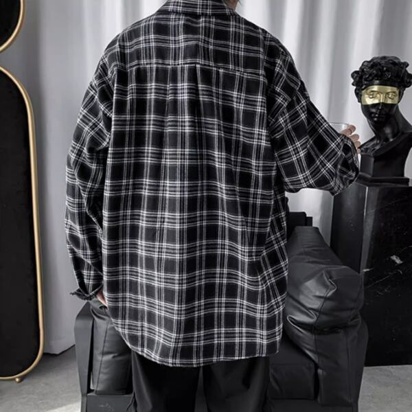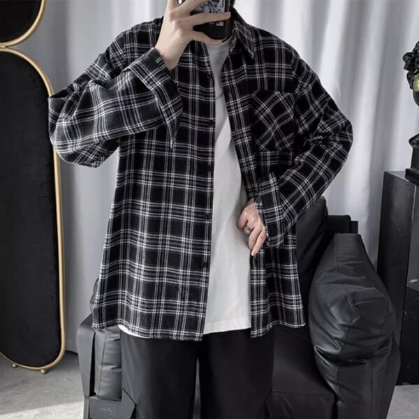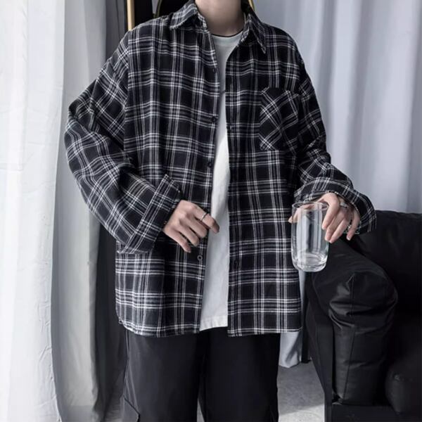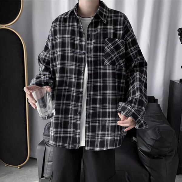 メンズチェック柄長袖シャツ。韓国のトレンドを取り入れたオーバーサイズのシルエットがルーズでカジュアルな雰囲気を演出します。薄手の素材で、シーズンレスに活躍する一枚。さまざまなコーディネートにマッチし、幅広いシーンで活躍します。