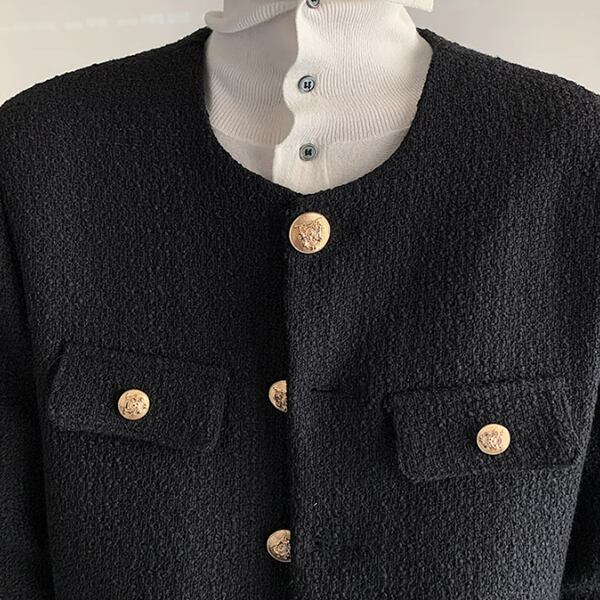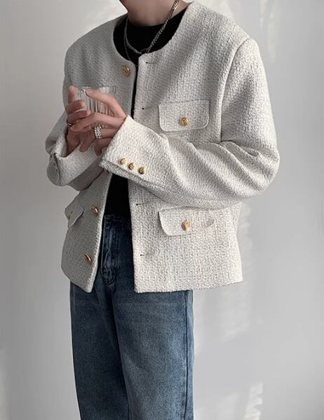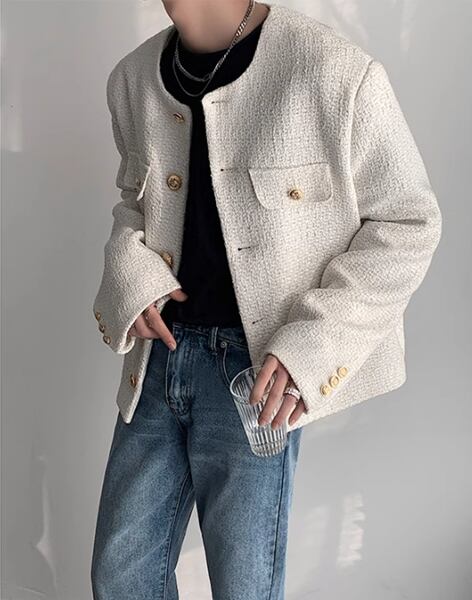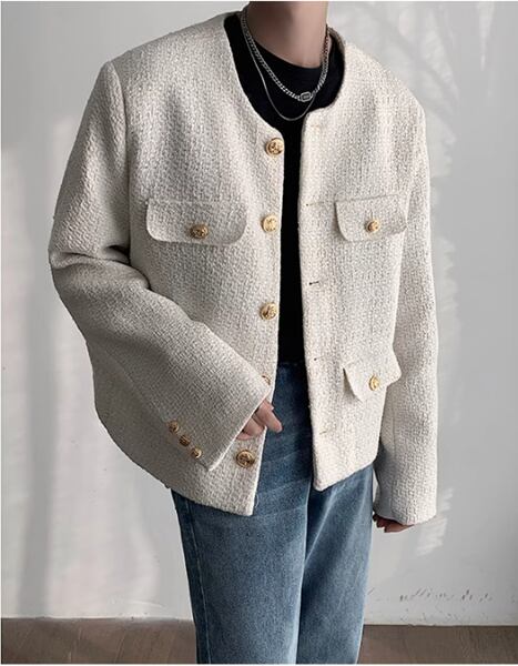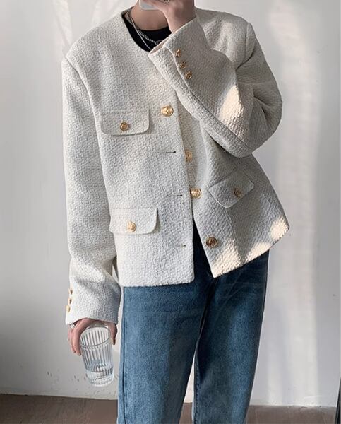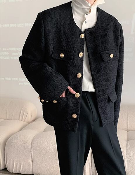 レトロな雰囲気漂うスタイリッシュなラウンドネックジャケット。メンズ向けの韓国風ファッションを象徴するカジュアルでネットセレブ感漂うラグジュアリーな一着。春や秋の季節にぴったりな着心地の良い素材で、レトロな小さな香りが漂うファッション感度の高い一枚です。