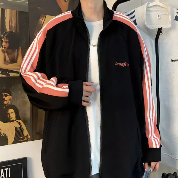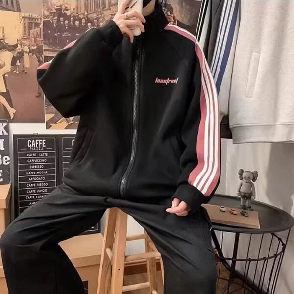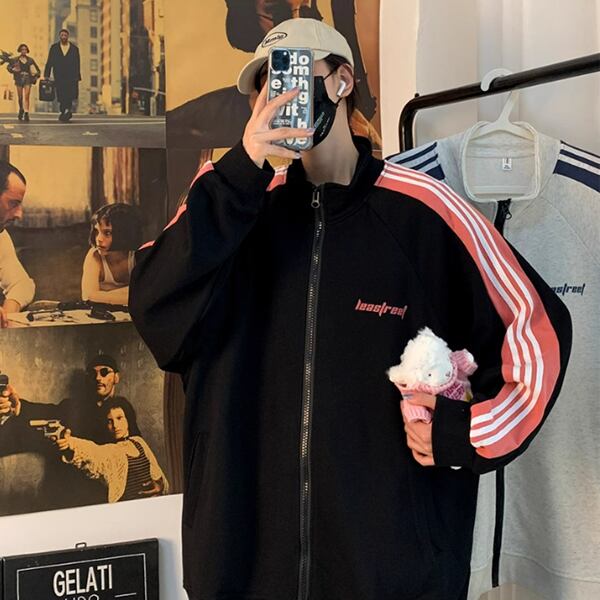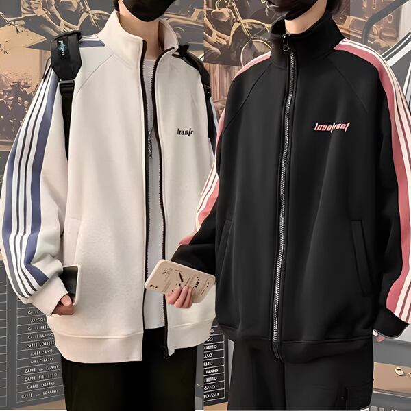 2色展開 カジュアルスポーツカーディガン ルーズカップルジャケット ベルベットジャケット メンズ トップス トレーナー 長袖 スタンドカラー サイドシームポケット ジッパー トレンド ストライプ カジュアル 春 秋 ロングシーズン 男女兼用 10代 20代 通勤 通学 アウトドア ガーデン ライブ ゆったり ホワイト ブラック