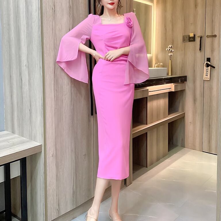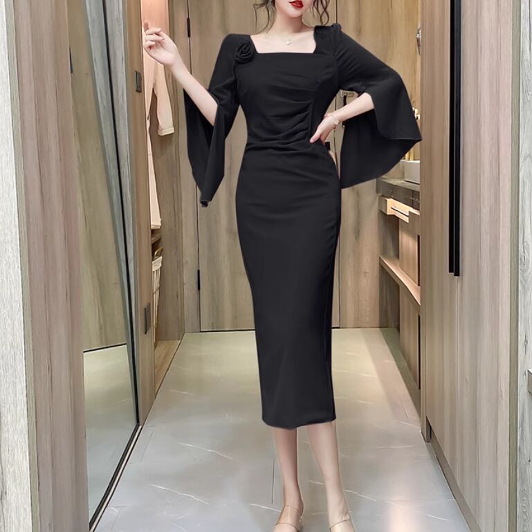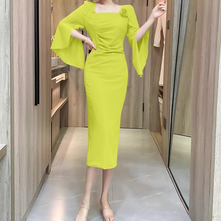 ドレス ワンピース ウェディング パーティー 結婚式 二次会 披露宴 演奏会 発表会 ステージ 舞台 ダンス 衣装 膝下 ミモレ 長袖 スクエアネック タイト スリム 細身 Iライン 可愛い きれいめ シンプル カジュアル 大人可愛い 上品 おしゃれ かっこいい レトロ アジアン エキゾチック キュート クール モード エレガント モダン 主役級 存在感 クラシック ゴージャス エレガント セクシー 華やか クラシカル 無地 二の腕カバー 美脚 脚長 高見え S M L XL イエロー ピンク ブラック